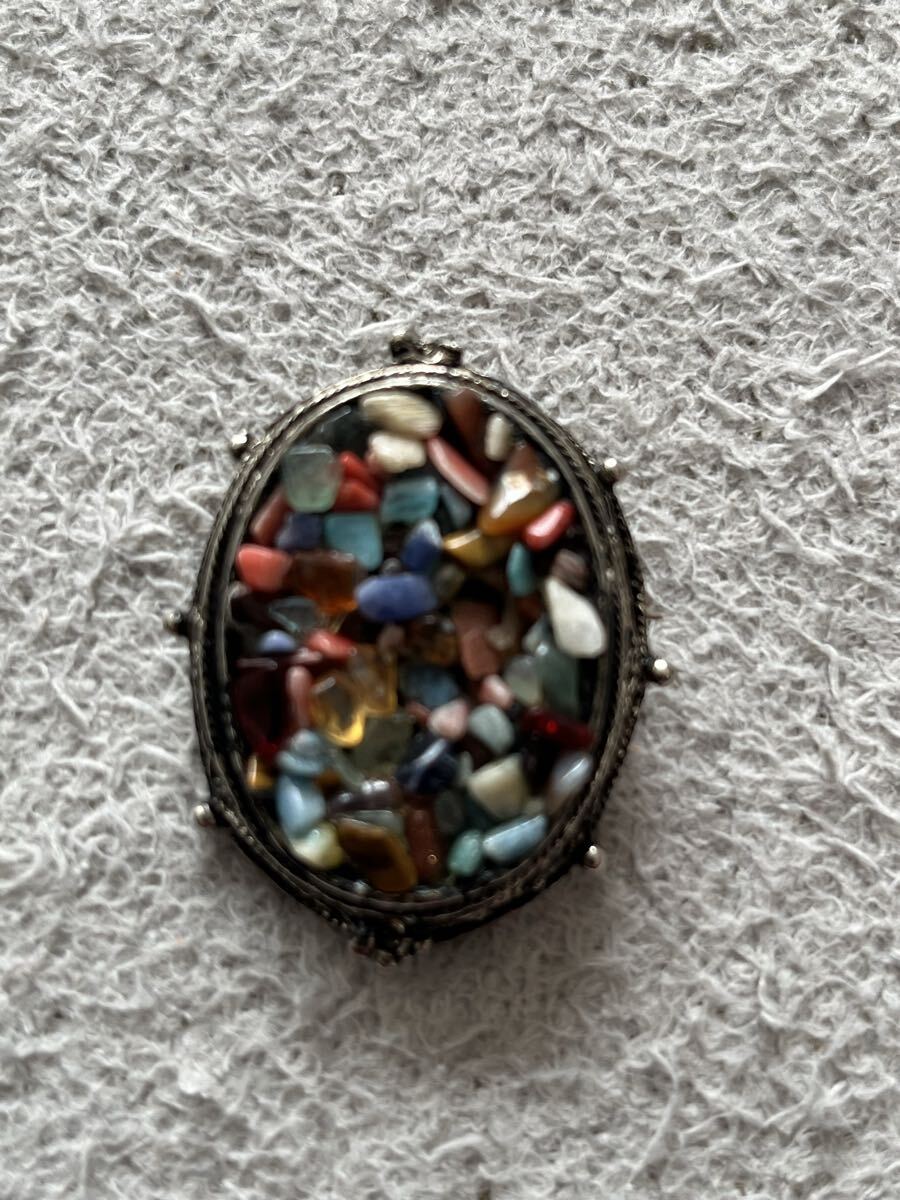 多色の小石を使用したユニークなブローチ。