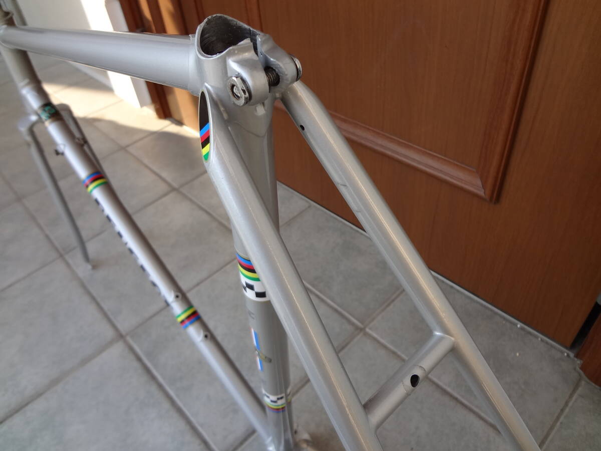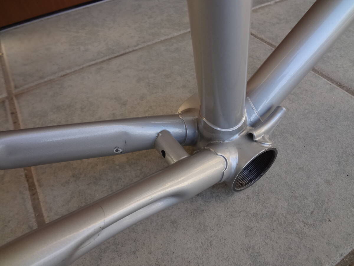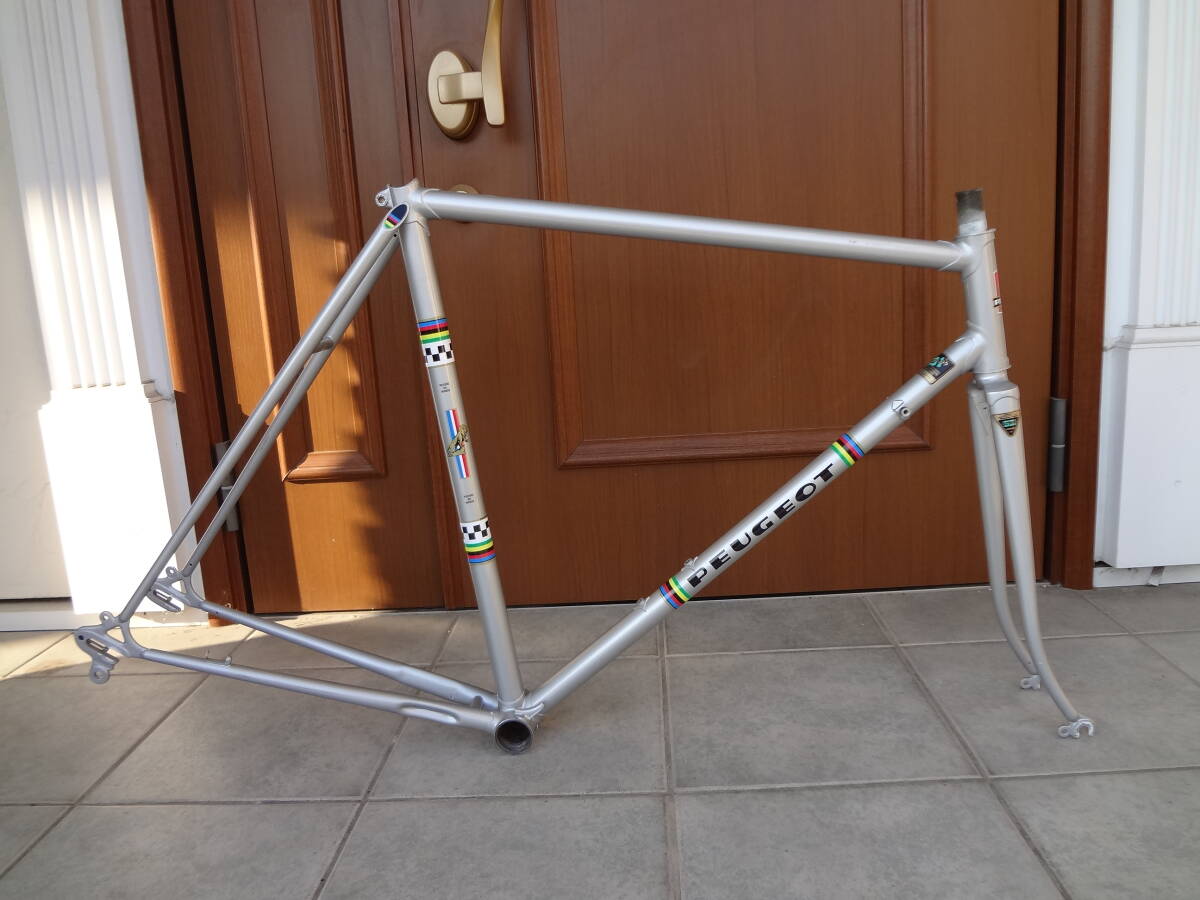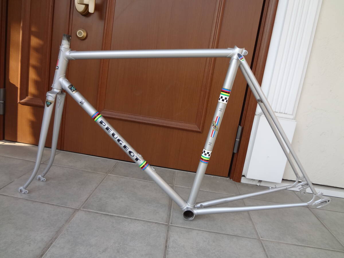 プジョーのロードレーサーフレームです。おそらくPX10だと思います。再塗装しデカールも当時のデザインでレストアしていますす。フレームの寸法は、素人採寸ですがシートチューブ長:540mm(C-C555mm(C-T)、トップチューブ長:550mm(C-C)、エンド幅は前100mm、後126mm。シートポスト径26.6mm。ステムコラム径22.0mm、BB幅68mm、BBネジ規格:BSC(JIS)。サンプレエンド、変速レバーサンプレ台座。フレームの状態ですが、再塗装しており艶もあり全体的には綺麗な状態です。ただ、一度組み立てたフレームですので、パーツの取り付け等でトップチューブほかにスレ傷・塗装剥がれがありますが、大きな傷や凹みはありません。昨年に再塗装しフレンチパーツで組んだのですが、サイズが小さすぎ別のフレームで組み替えたため出品するものです。10枚目の写真が昨年に組み上げたものです。あくまでも出品物はフレームのみですのでご注意ください。サンプレックスのシートピンが付属します。