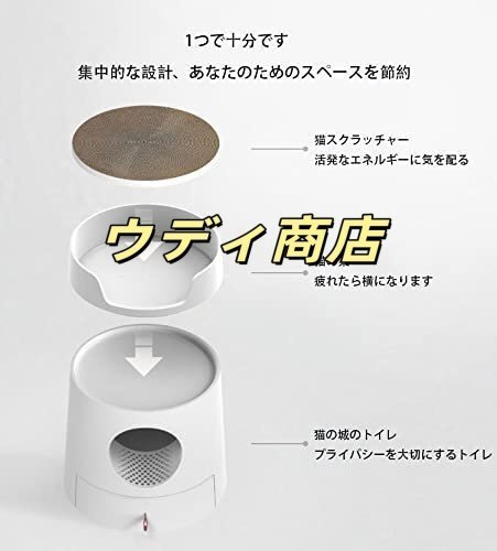 広々としたスペース:トイレの内部は広々としており、大型の猫でも楽に移動できます。猫のプライバシーを守ります。約5kgの太った猫にも対応し、あらゆる種類の猫が自由に出入りできます。 キャットキャッスル:上下2層構造で、猫砂と猫の爪とぎボードを備えています。ペット