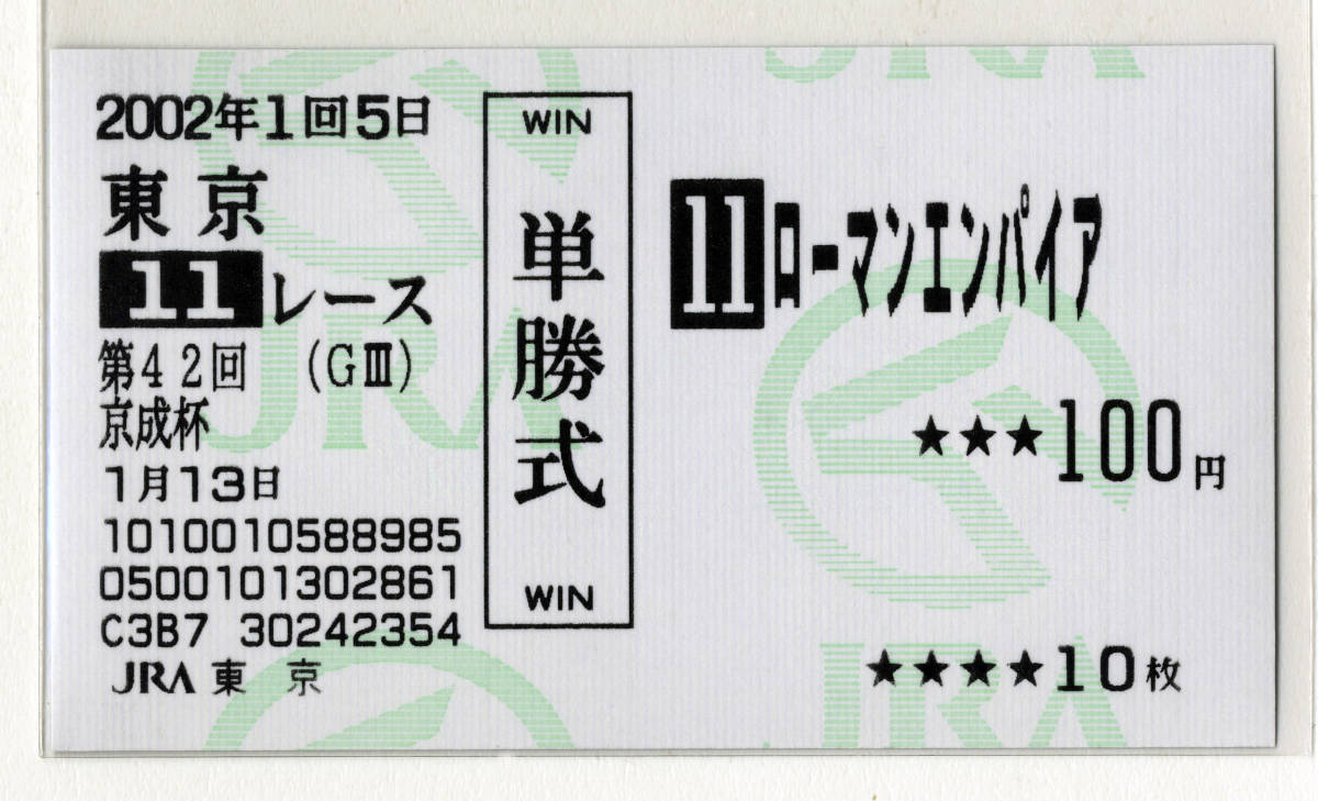 | ★ローマンエンパイア 第42回京成杯 現地的中 単勝馬券 旧型馬券 2002年 武幸四郎 JRA 競馬 即決 | |