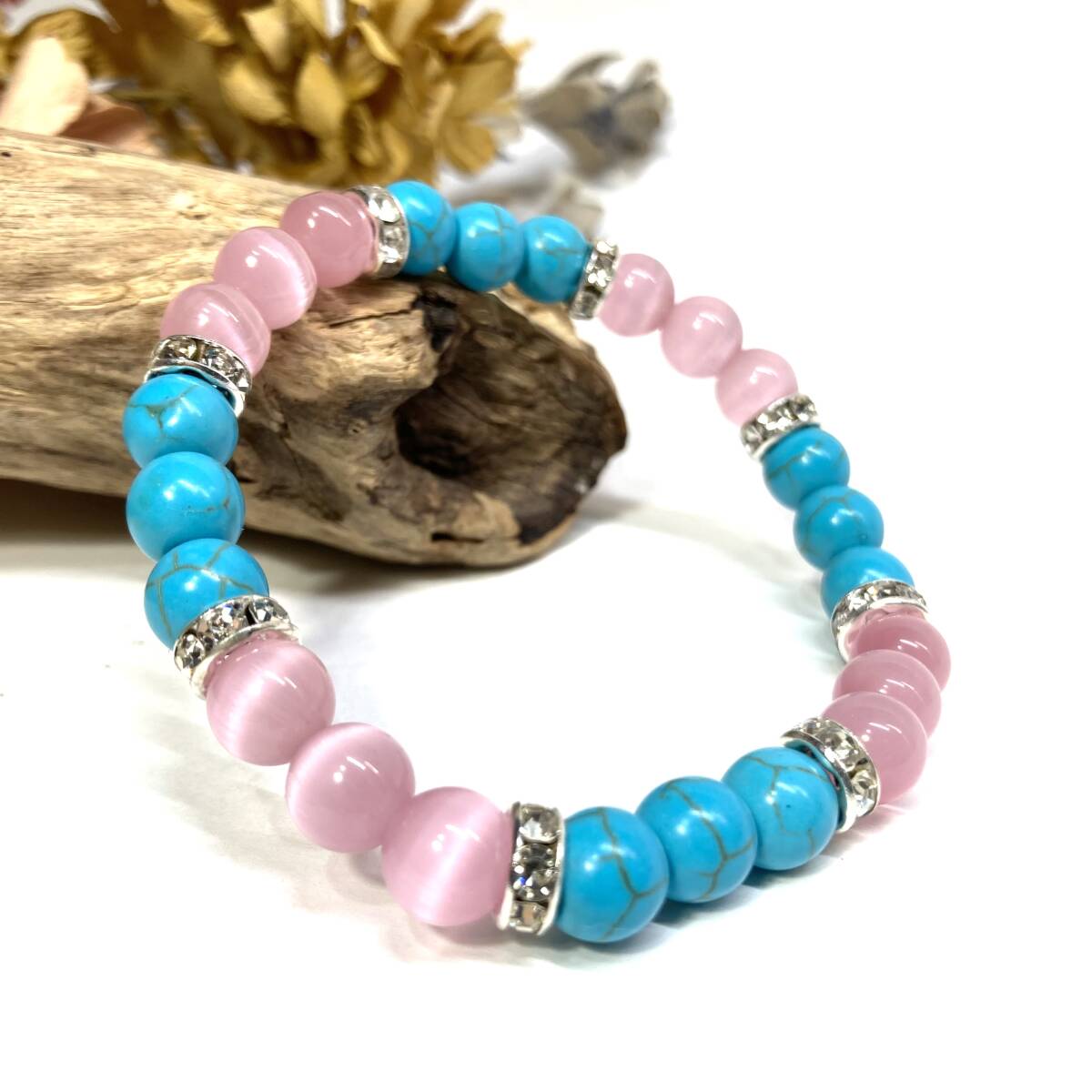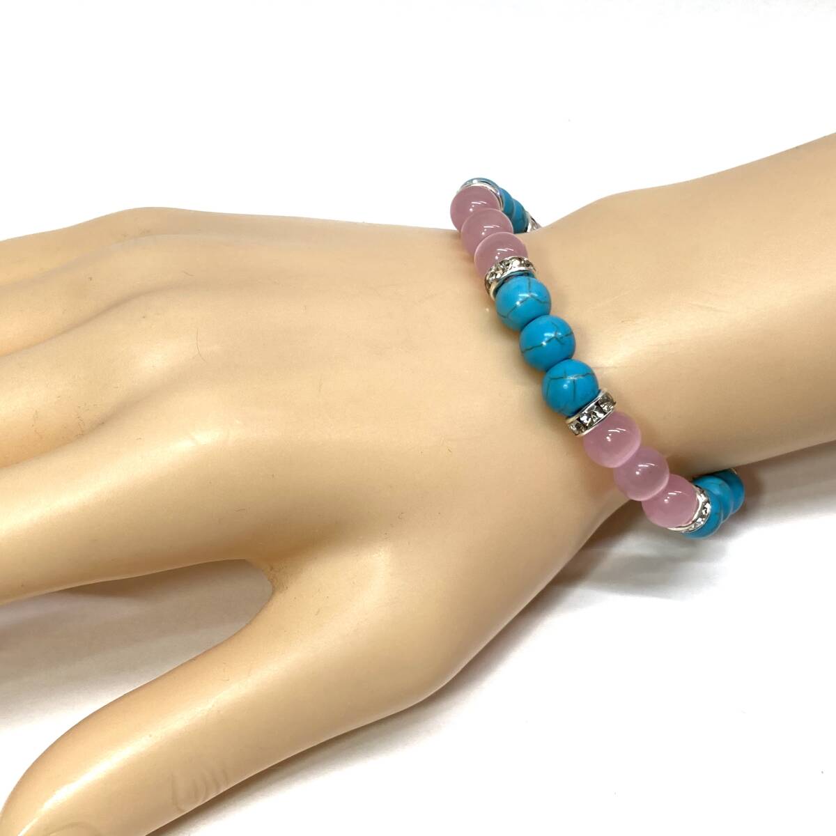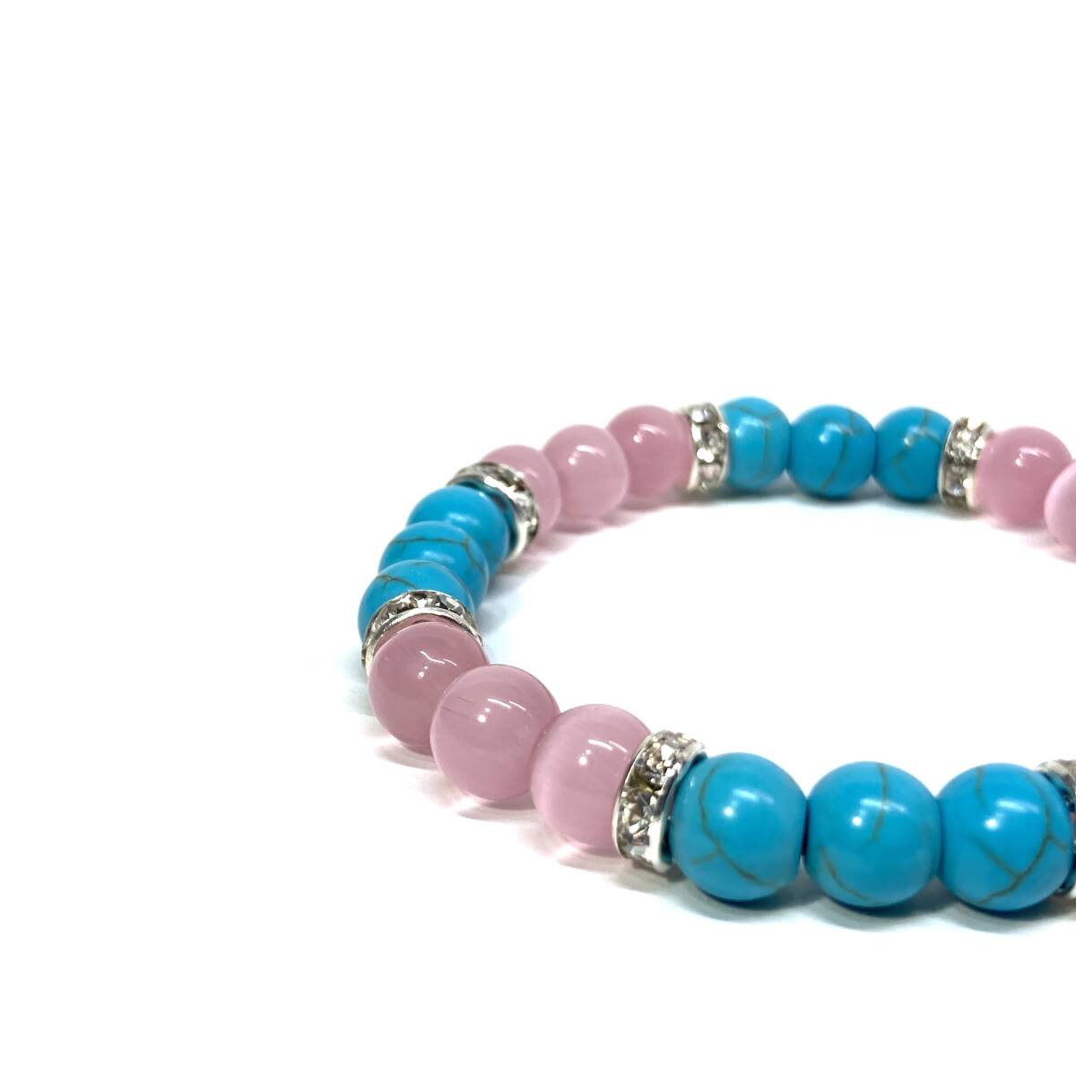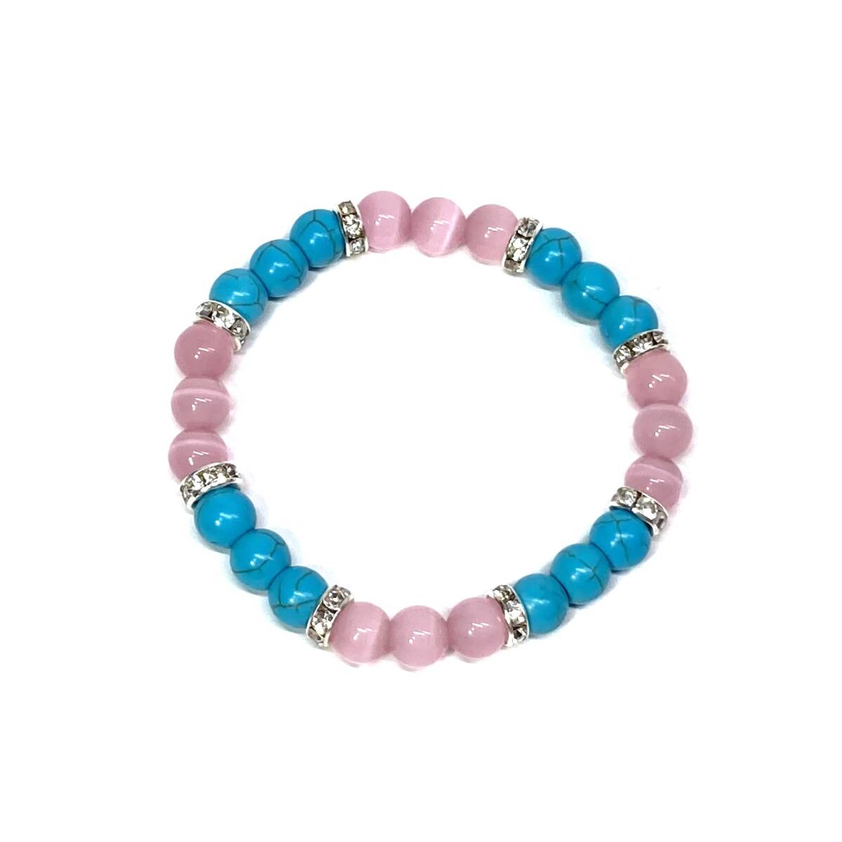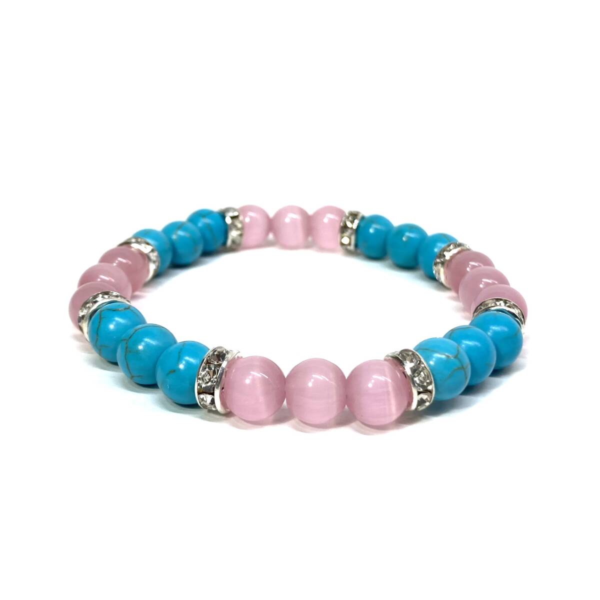 こちらは、8mm玉のホワイトキャッツアイとターコイズを使用したパワーストーンブレスレットです。間にはロンデルを挟み高級感ある大人っぽいデザインに仕上がっています。内周約16cmです。気になる方は是非この機会にどうぞ。