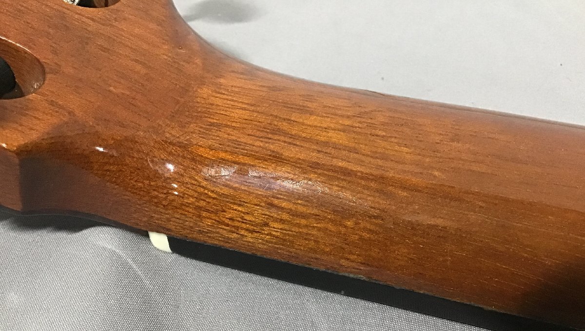 ネック裏に木部に達するダメージと指板接着部分に段差を感じるひびがハイポジションまで有り(画像8)。