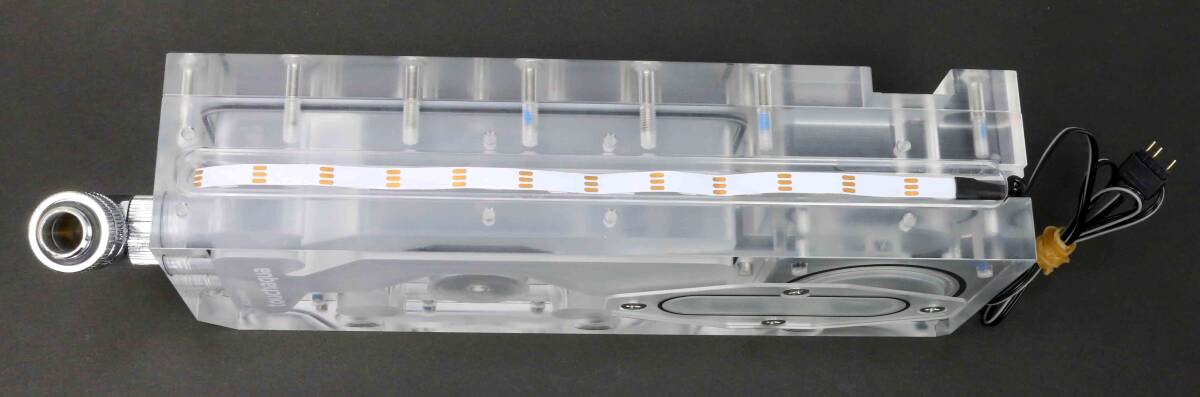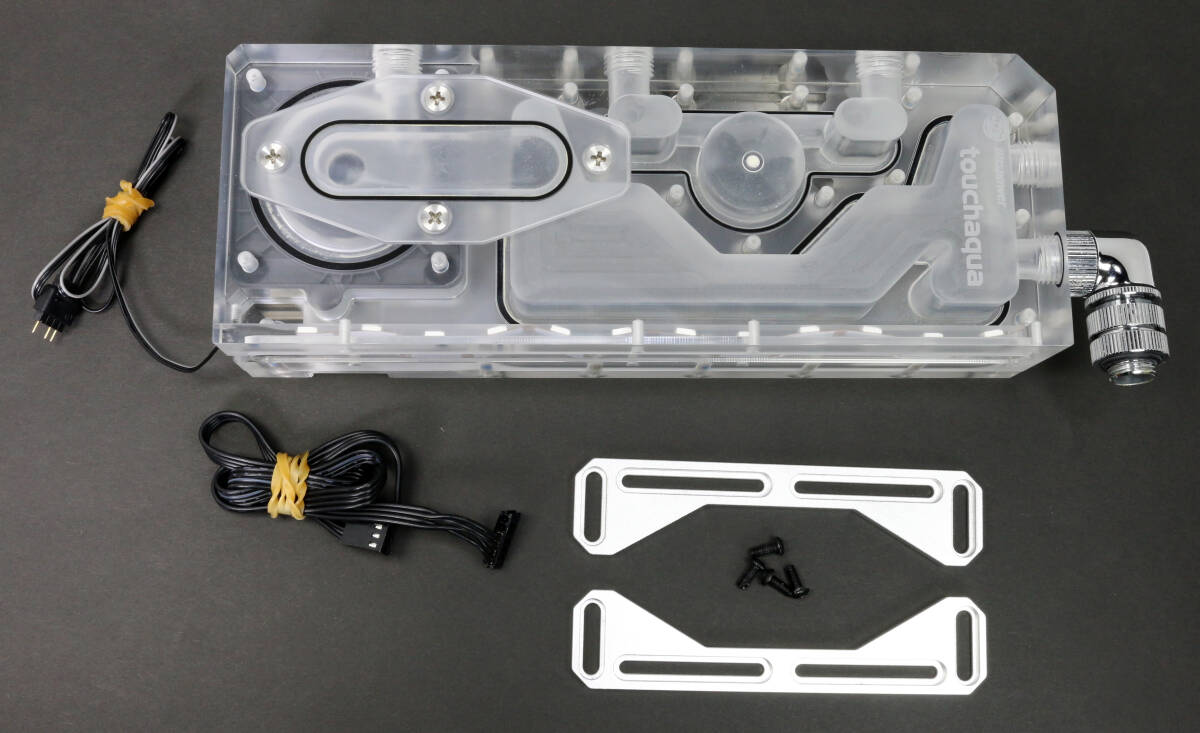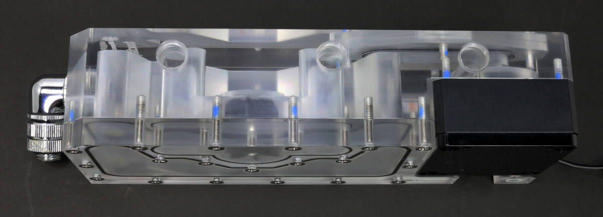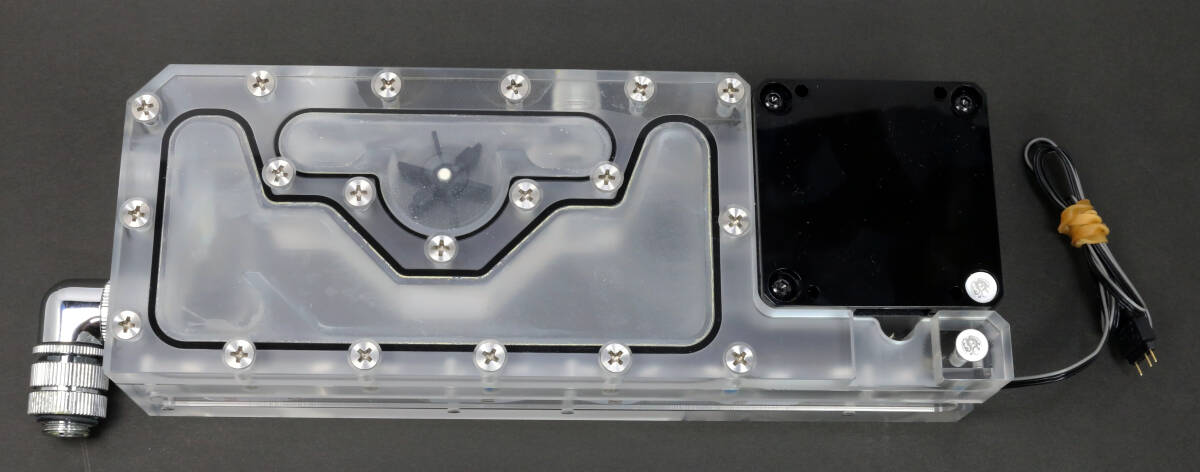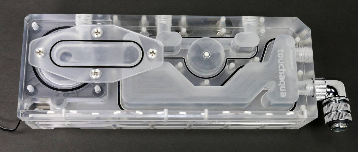 Bitspower製のポンプ一体型リザーバータンク「Touchaqua XYZ Reservoir Lite」だと思いますが詳細は不明です。