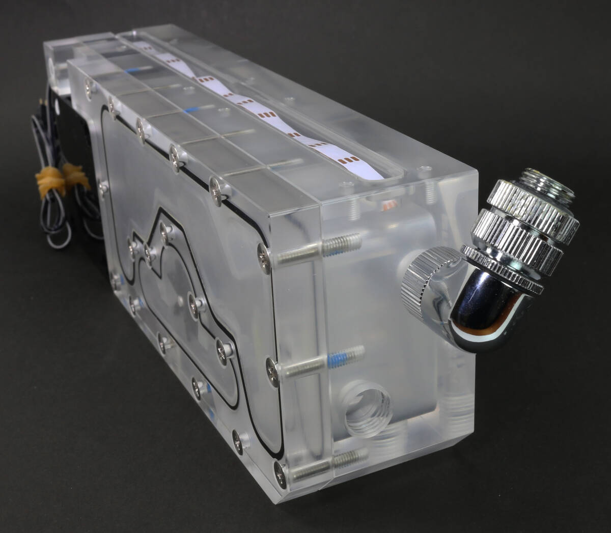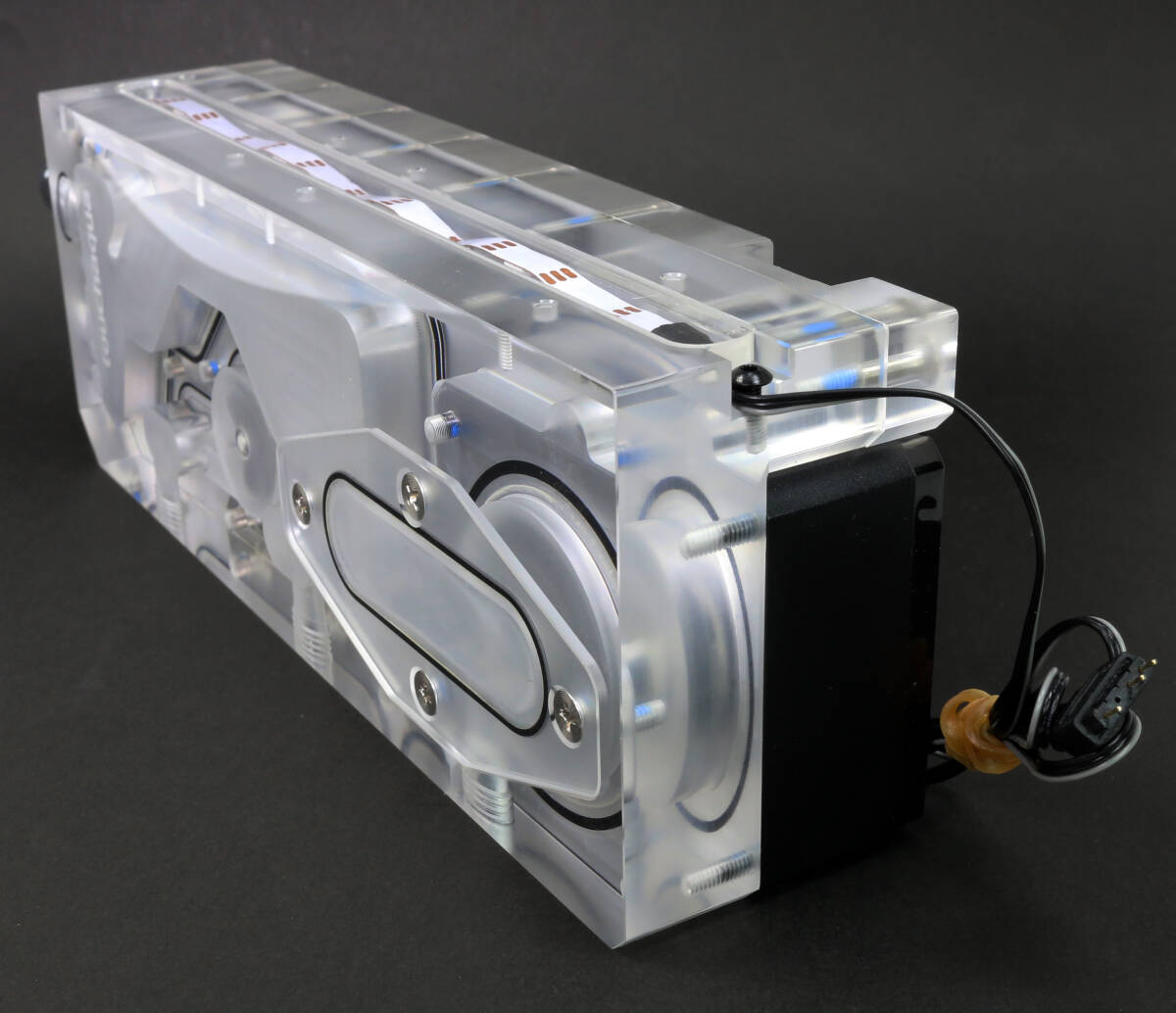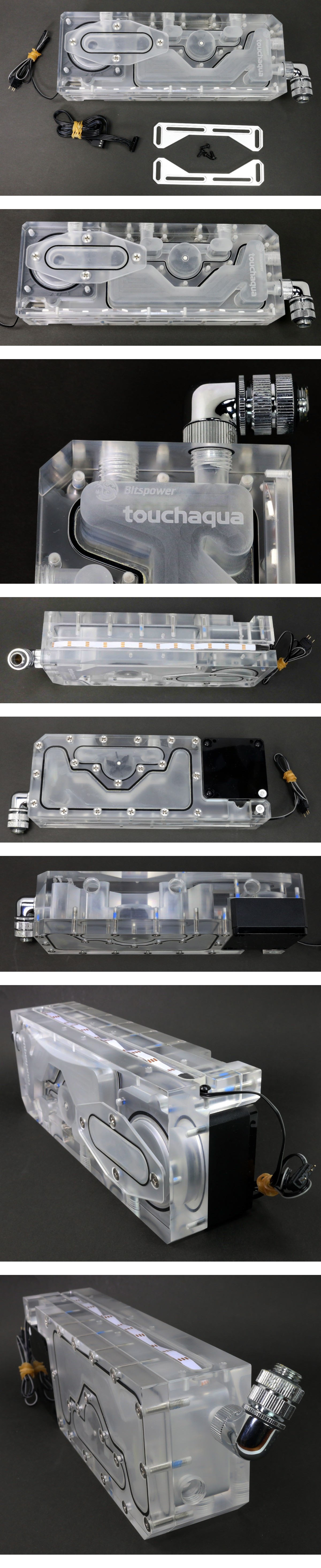 Bitspower製のポンプ一体型リザーバータンク「Touchaqua XYZ Reservoir Lite」だと思いますが詳細は不明です。