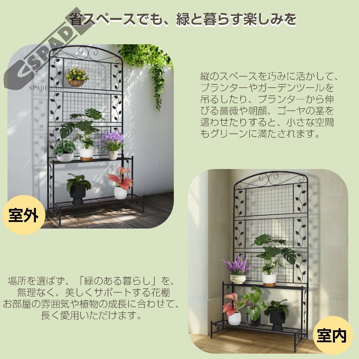 • 【省スペースでも、緑と暮らす楽しみを】縦のスペースを巧みに活かして、プランターやガーデンツールを吊るしたり、プランターから伸びる薔薇や朝顔、ゴーヤの茎を這わせたりすると、小さな空間もグリーンに満たされます。 場所を選ばず、「緑のある暮らし」を、無理なく、美しくサポートする花棚お部屋の雰囲気や植物の成長に合わせて、長く愛用いただけます。