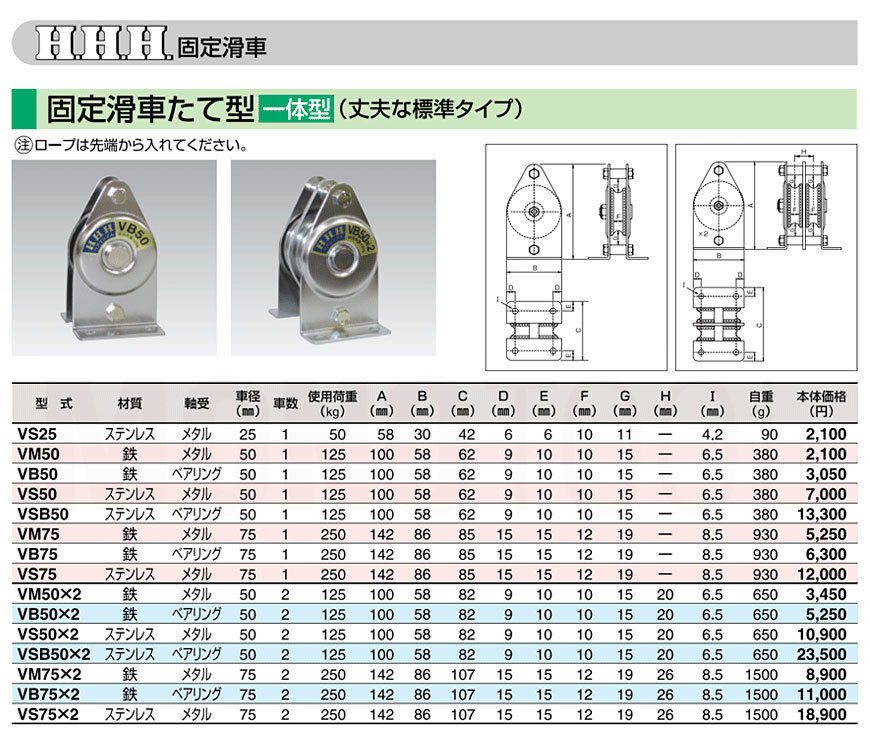 ③ 未使用保管品 H.H.H. スリーエッチ 固定滑車 たて型2車ベアリング入り75mm VB75X2 使用荷重250kg