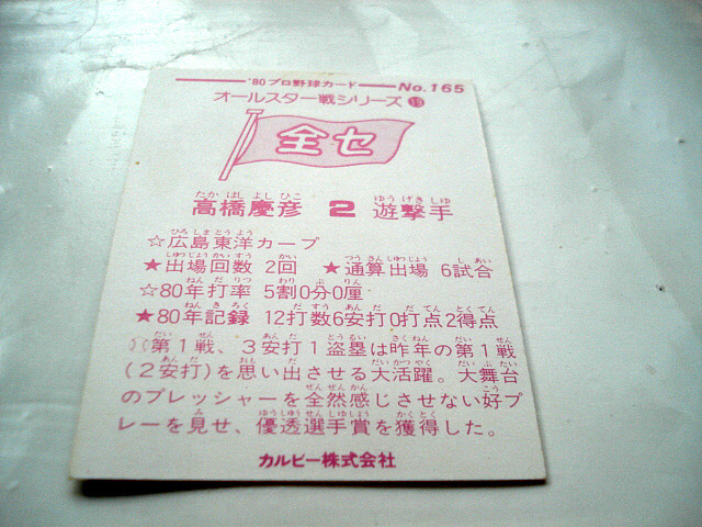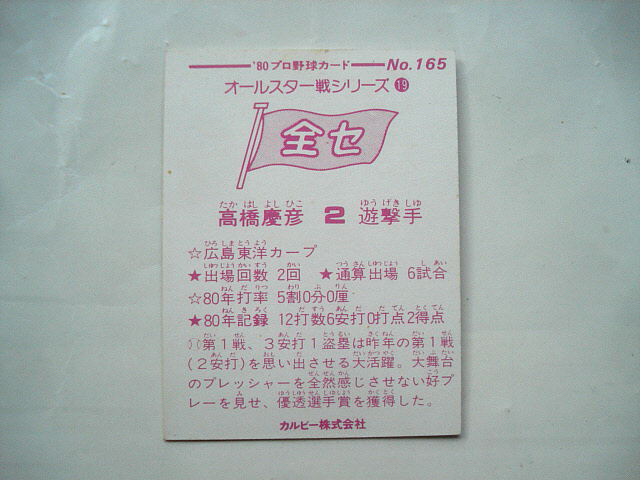 カルビー 1980年 165番 高橋慶彦 広島東洋カープ オールスター戦シリーズ19 '80オールスター戦 '80プロ野球カード