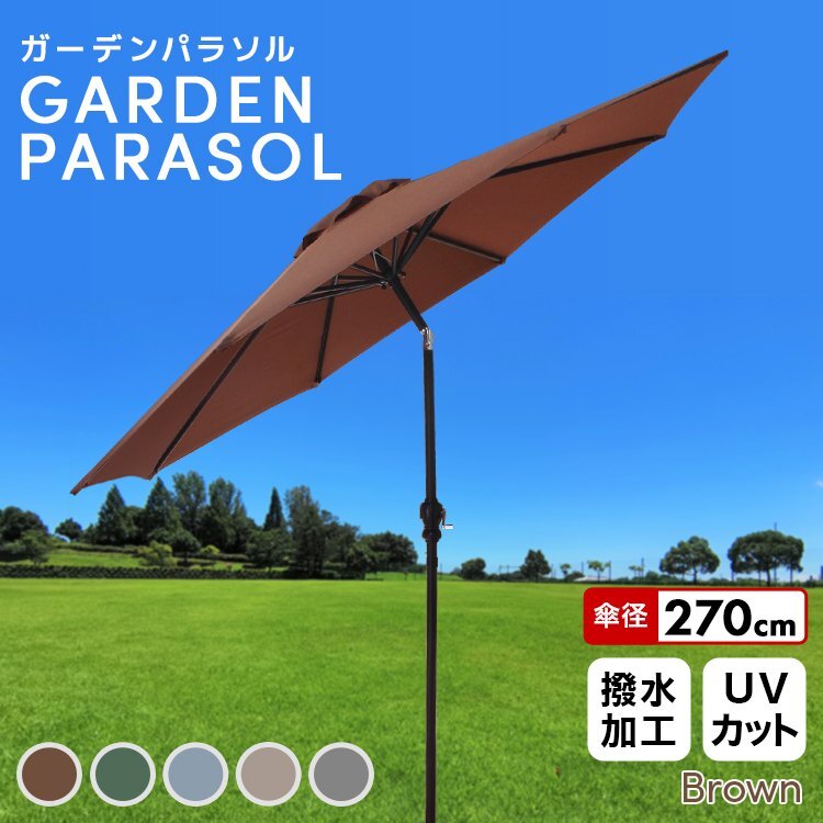 バーベキューにピクニックにビアガーデンと晴れた日には欠かせないアイテム! 日差しの向きにあわせて傘の角度調整ができる便利なガーデンパラソルです。 パラソルの開閉には、普通の傘とは違いハンドル式を採用。 ハンドルをクルクルと回すだけで開閉できるので、これほど大きなパラソルでも女性一人で簡単に開閉できます。 UVカットが施された270cmという大きなパラソルが強い日差しから守ってくれるので、 直射日光を気にせず快適にガーデンライフを楽しんでいただけます! アルミ製支柱なので木製パラソルと比較して軽量! ご自宅のお庭、バルコニー、テラスや店舗先のカフェペースなどにお使いいただけます。 河原でのバーベキュー、夏場にお子様のプール遊びの時にご使用になっているお客様もいらっしゃいますよ 【商品仕様】 ・カラー:ブラウン ・サイズ:(約)φ270cm×H240cm ※ポールの直径:(約)3.8cm ・収納時サイズ:(約)140cm×25cm ・重量:(約)4.6kg ・素材:ポリエステル、スチール、アルミ他 ※パラソルベースは別途ご用意ください※ 【注意事項】 ・傘生地には撥水加工をしておりますが、完全防水ではありません。 ・風や雨が強い日の使用は危険ですので、ご使用しないでください。 パラソルやベースを地面に固定しても突風や瞬間的な豪雨などでパラソルが破損する場合がございます。 そのような自然現象による破損につきましては保証の対象外となりますのでご注意ください。 ・商品は、モニターによって色合いが異なって見える場合があります。 ・仕様・デザインは改良のため予告なく変更することがあります。