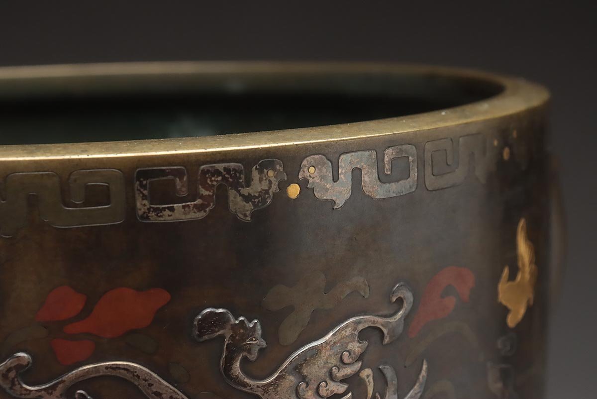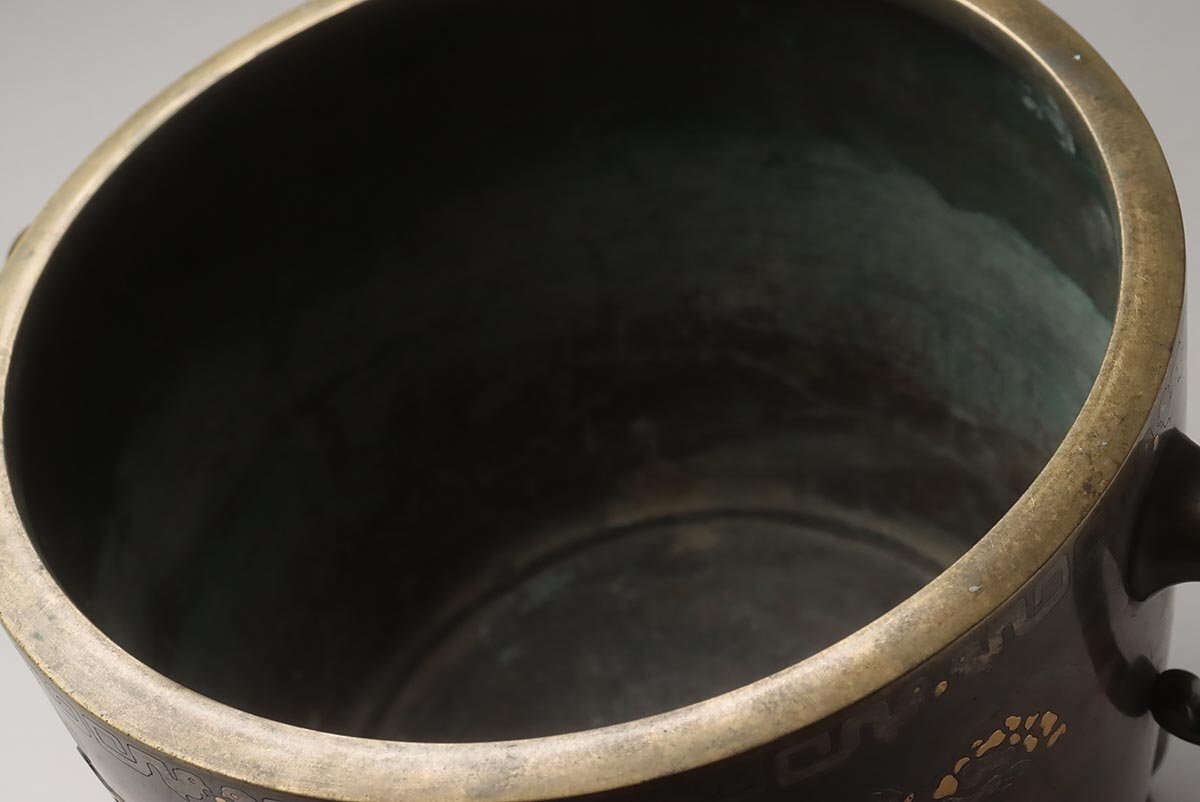 | ◆ 時代金工【春海藤次郎 造】金銀赤銅嵌火鉢 桑台付 高24.5cm 重5.8kg 共箱附・寧楽御物内絵様写 金銀色絵象嵌入古銅象耳火鉢 ◆