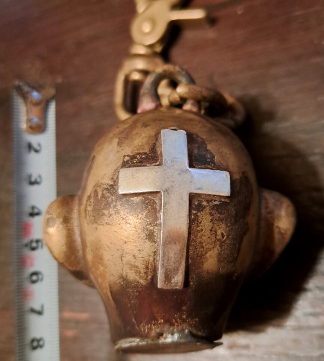 真鍮にシルバー925の十字架等を取り付けました ロウ付けです 目と牙と十字架はシルバー925です バーナーの熱で変色してますが磨けば光ります 取り付けの為の削り等でキズあります 発送はレターパックプラスです(仕事の都合で発送が遅くなることがあります)