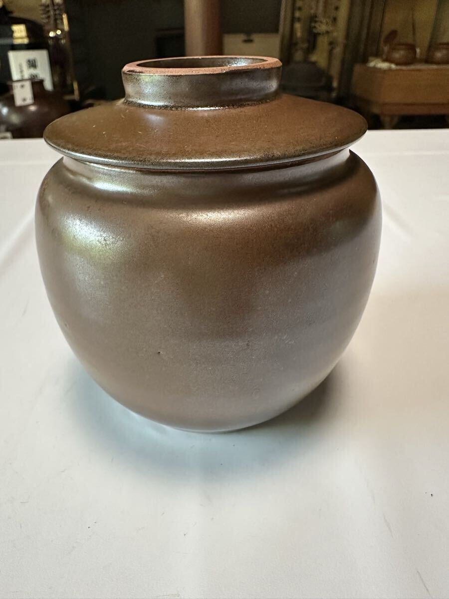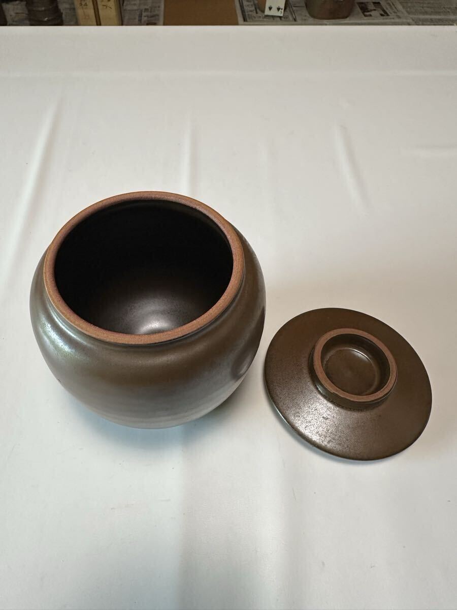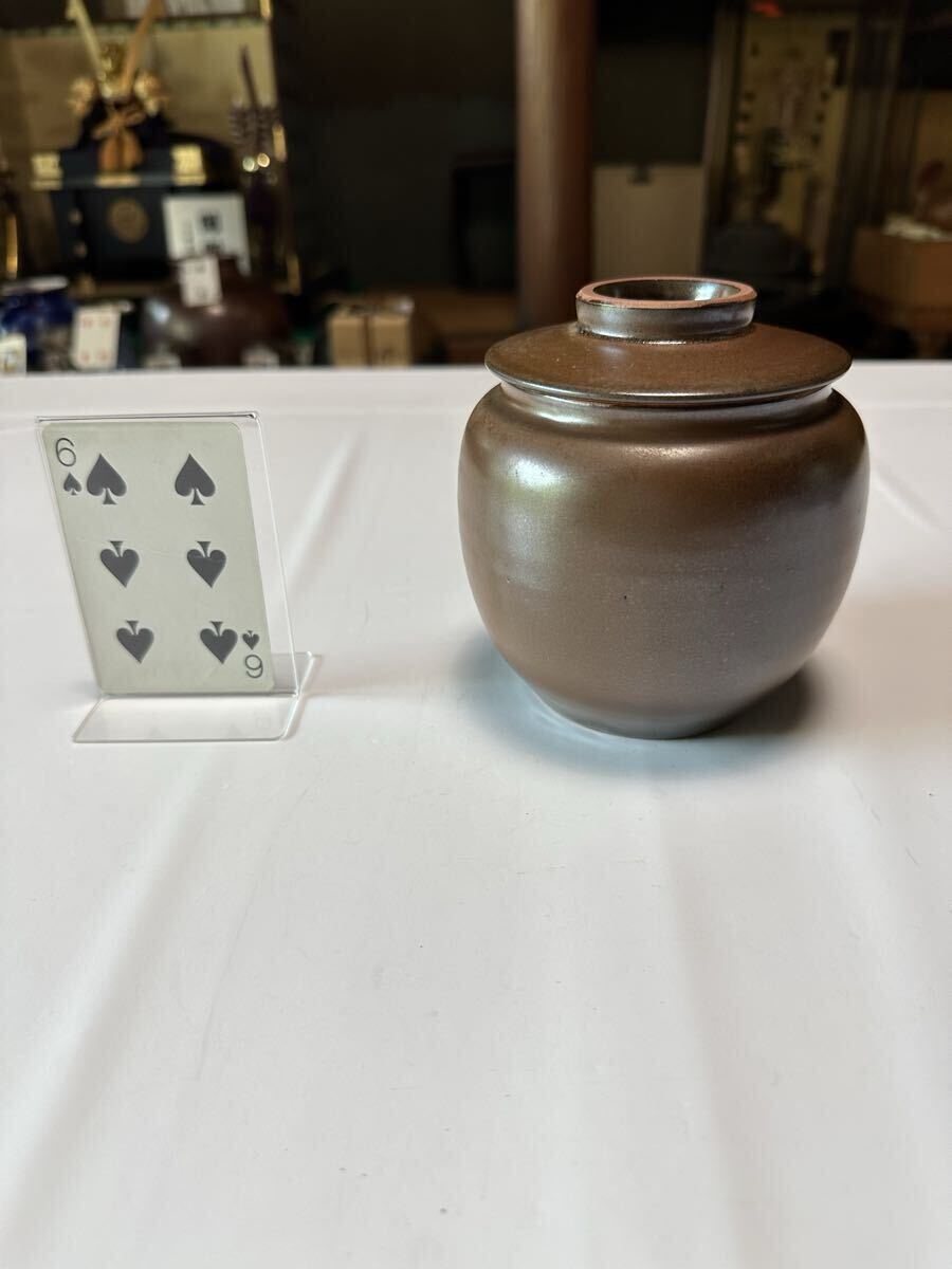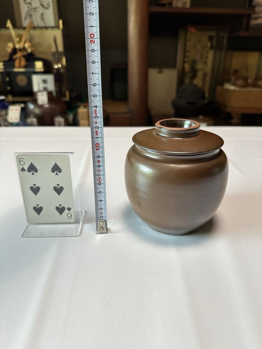 商品名:花器・壺 壺 茶色 刻印あり H=12センチ φ=11.5センチ 蓋付き