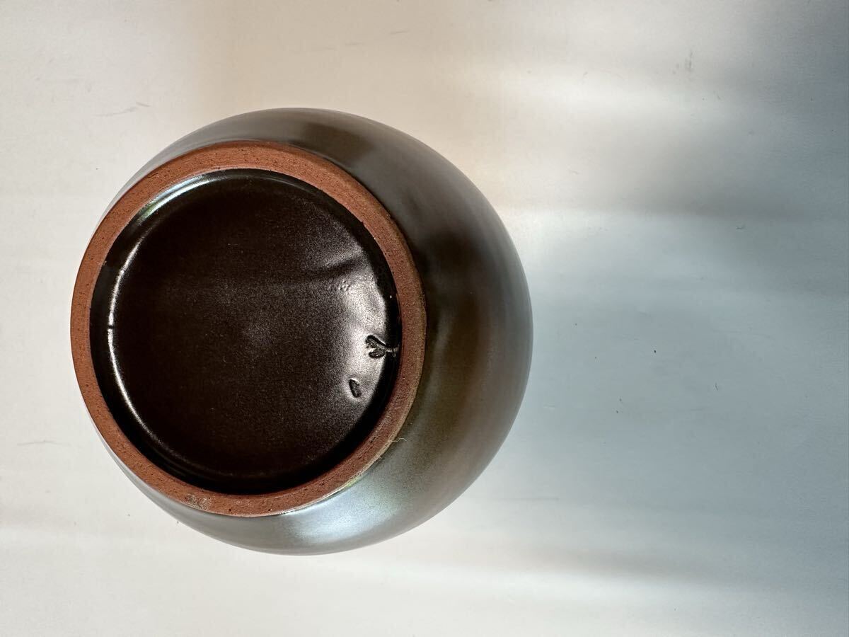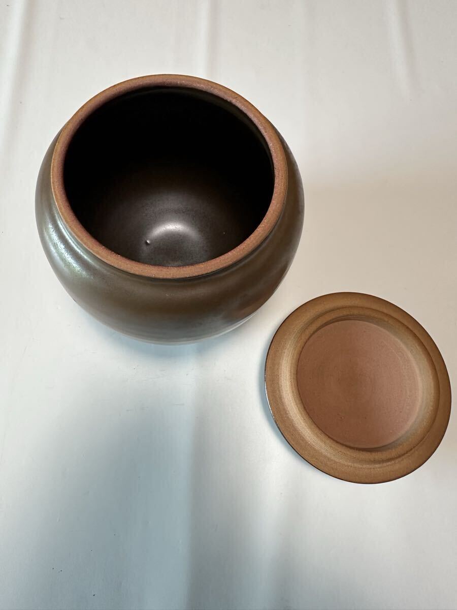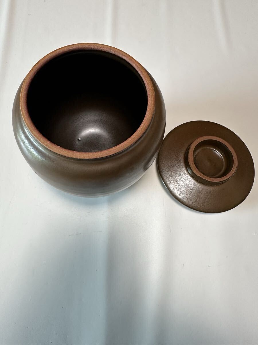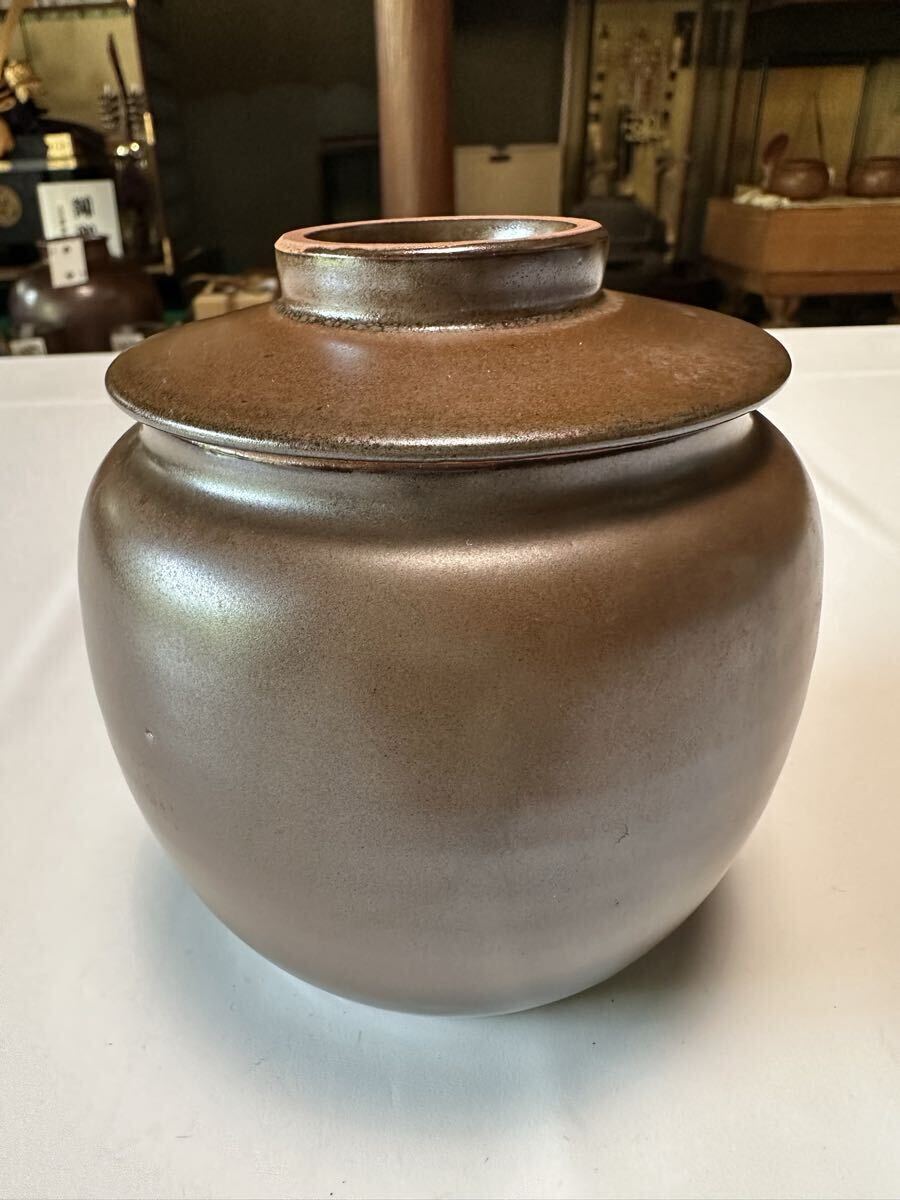 商品名:花器・壺 壺 茶色 刻印あり H=12センチ φ=11.5センチ 蓋付き