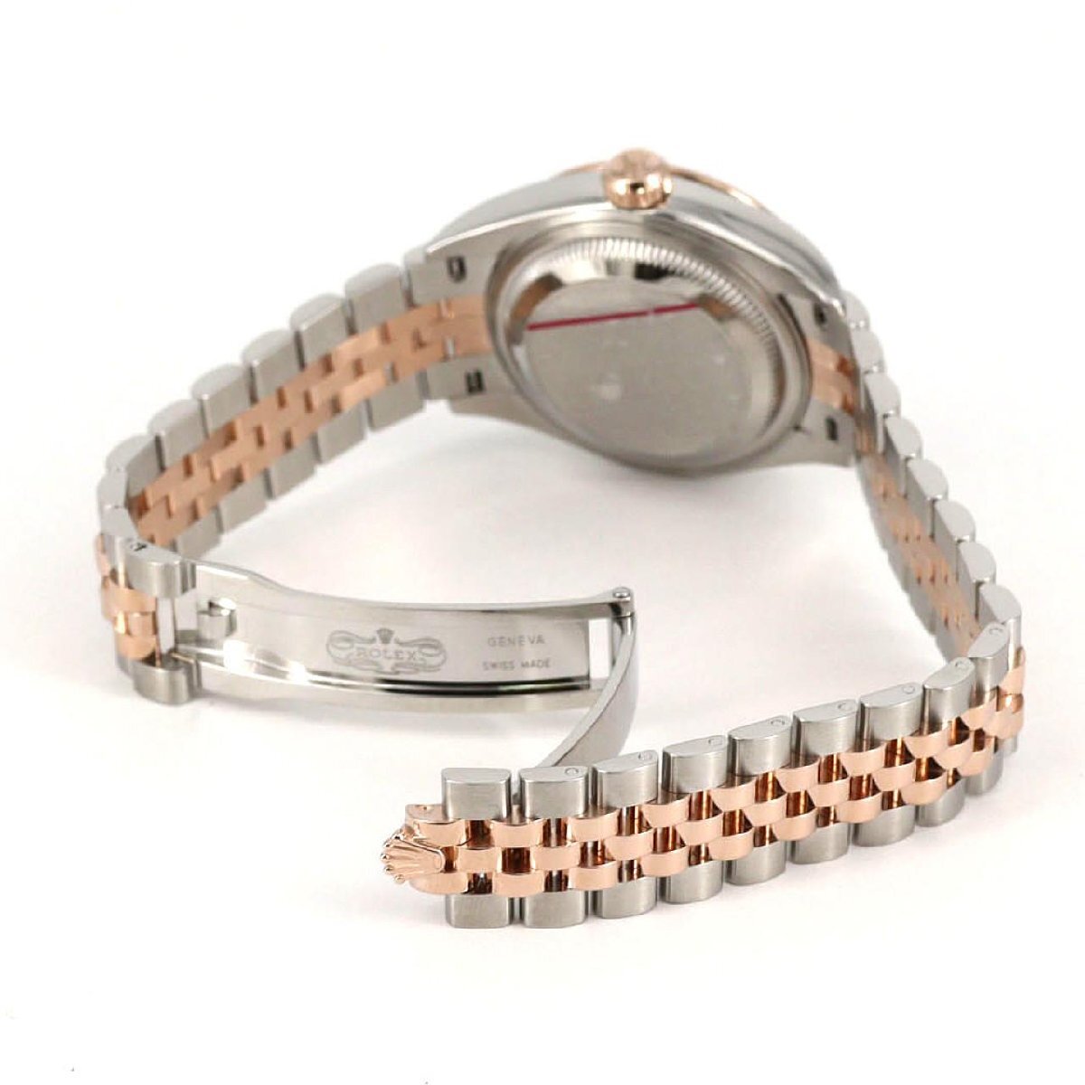 ロレックス伝統の王道モデル「デイトジャスト」。自動巻機能、防水性能、日付の瞬時切り替えという3大発明を詰め込んだ傑作モデルです。前モデルRef.179171に比べ、ケースサイズが2mmボリュームアップし、26mmから28mmになりました。ブレスレットが薄くなったことで、より快適な装着感です。ムーブメントの精度は上がりパワーリザーブも延長され、機能面でも充実しています。こちらは18金ピンクゴールドとステンレスのコンビモデルで、インデックスにダイヤモンドがセッティングされています。ロゼカラーの文字盤が可愛らしい女性らしさを演出しています。