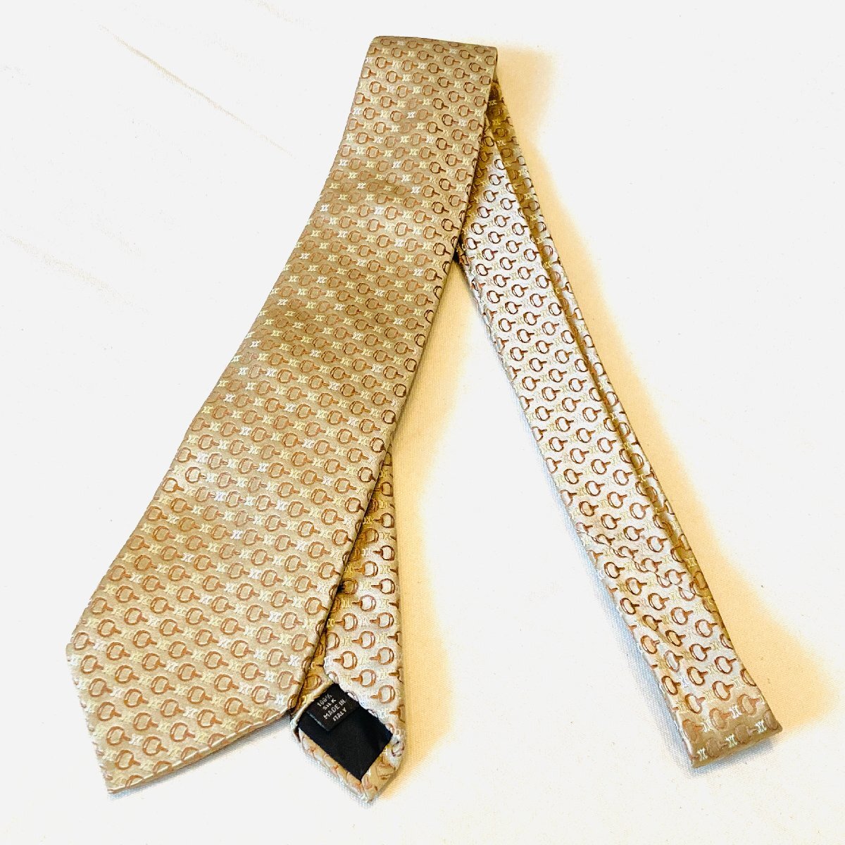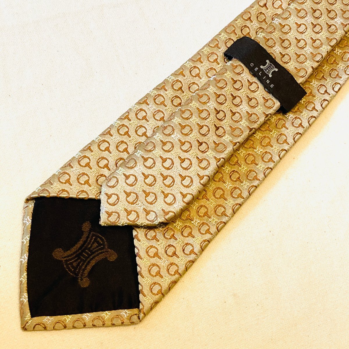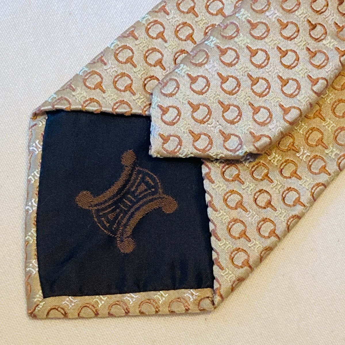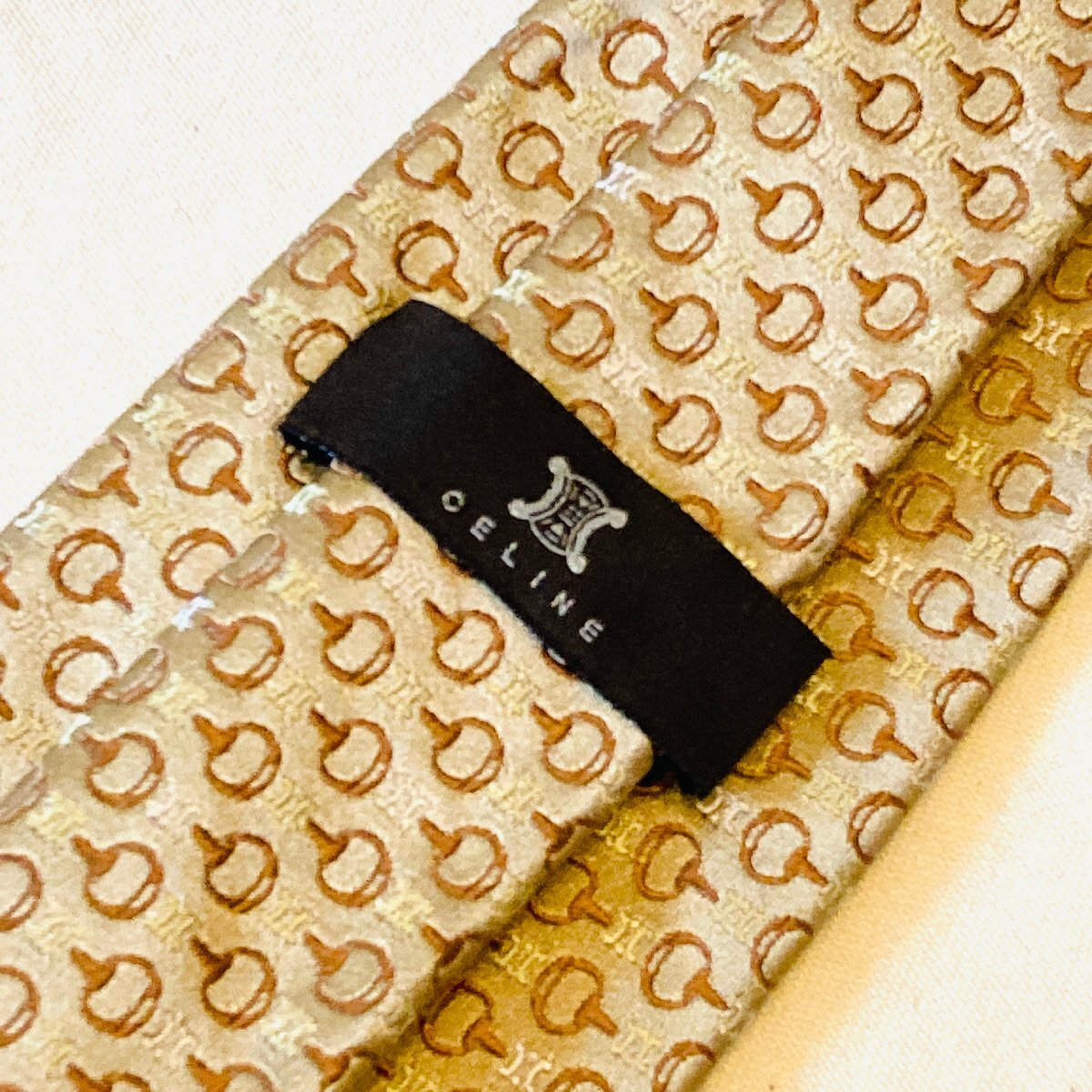 CELINE PARIS セリーヌ イタリア製 絹 シルク SILK 100% 高級 ネクタイ ゴールド/ベージュ系 総柄