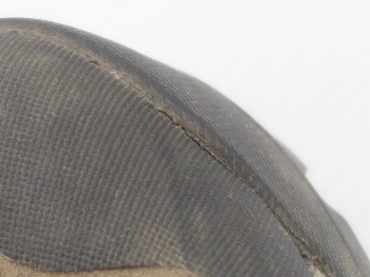 表面にスレやシワ、汚れ、内部にほこりなどの付着、ソールにすり減り、接着部分に剥がれがあります。