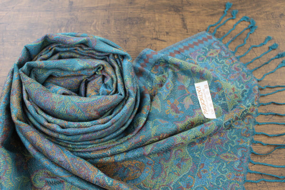 新品【パシュミナ Pashmina】ペルシャ柄 エメラルドグリーン系マルチカラー 緑 E.GREEN 大判 ストール カシミア100% Cashmere 訳あり