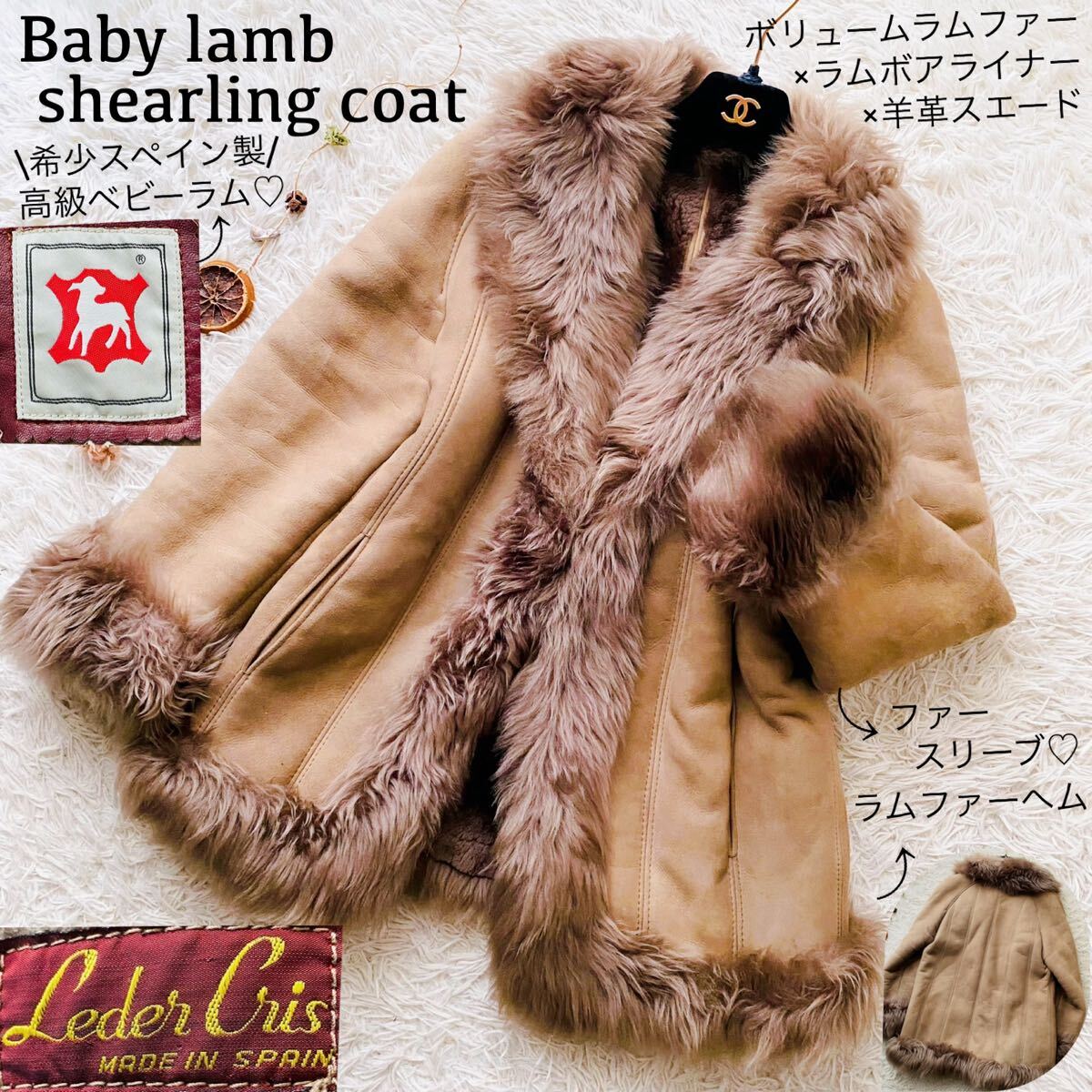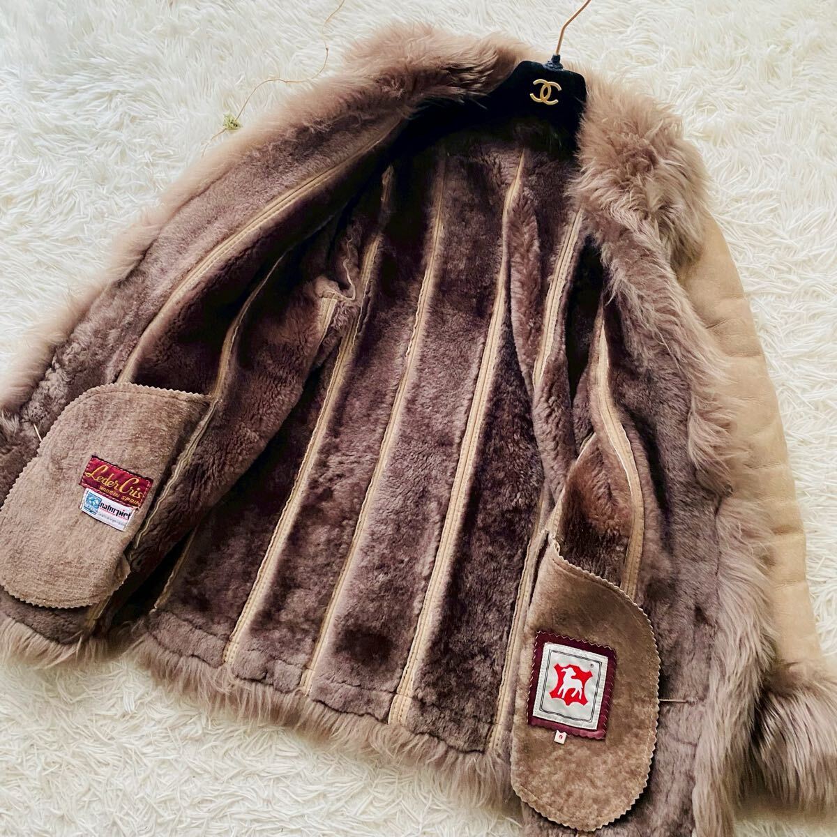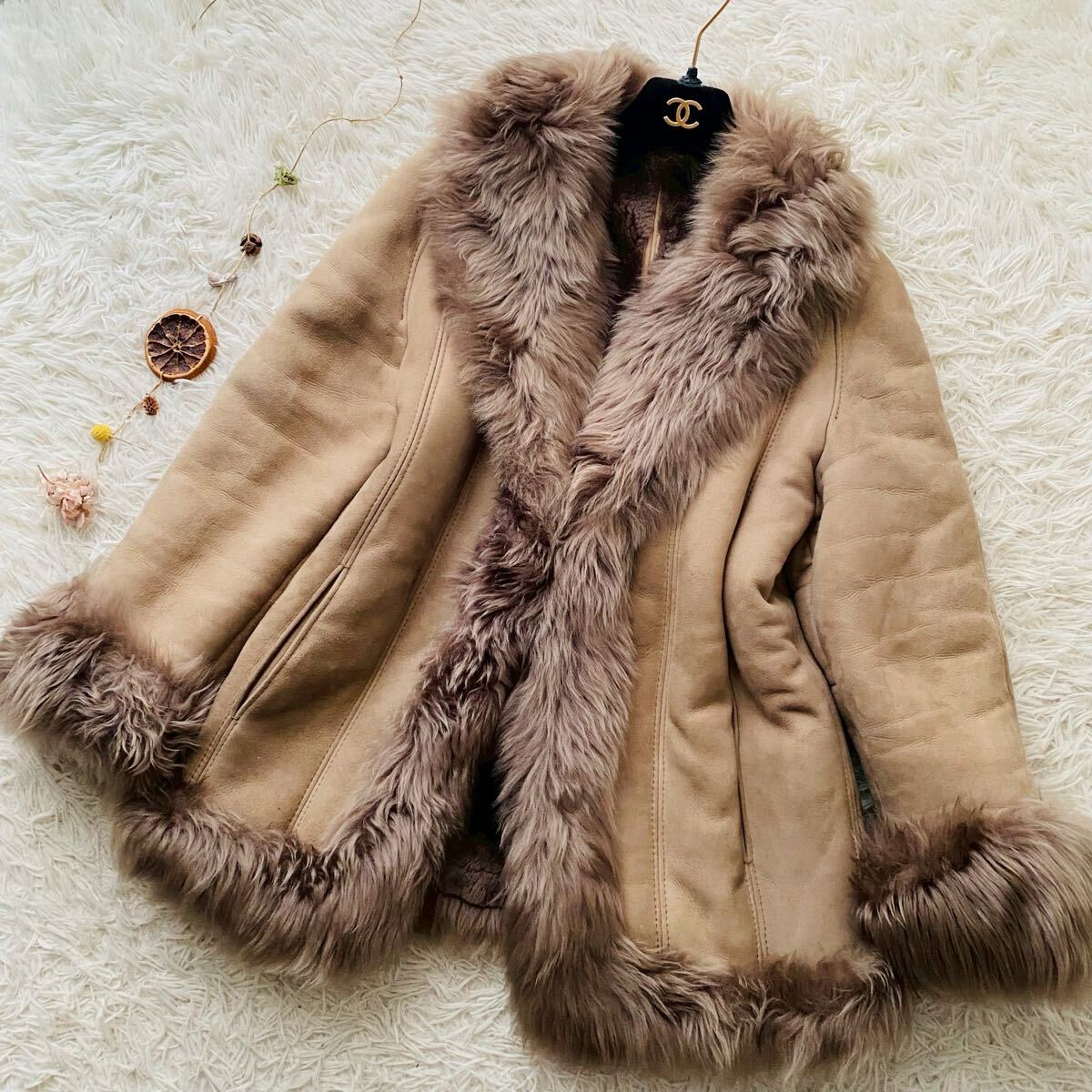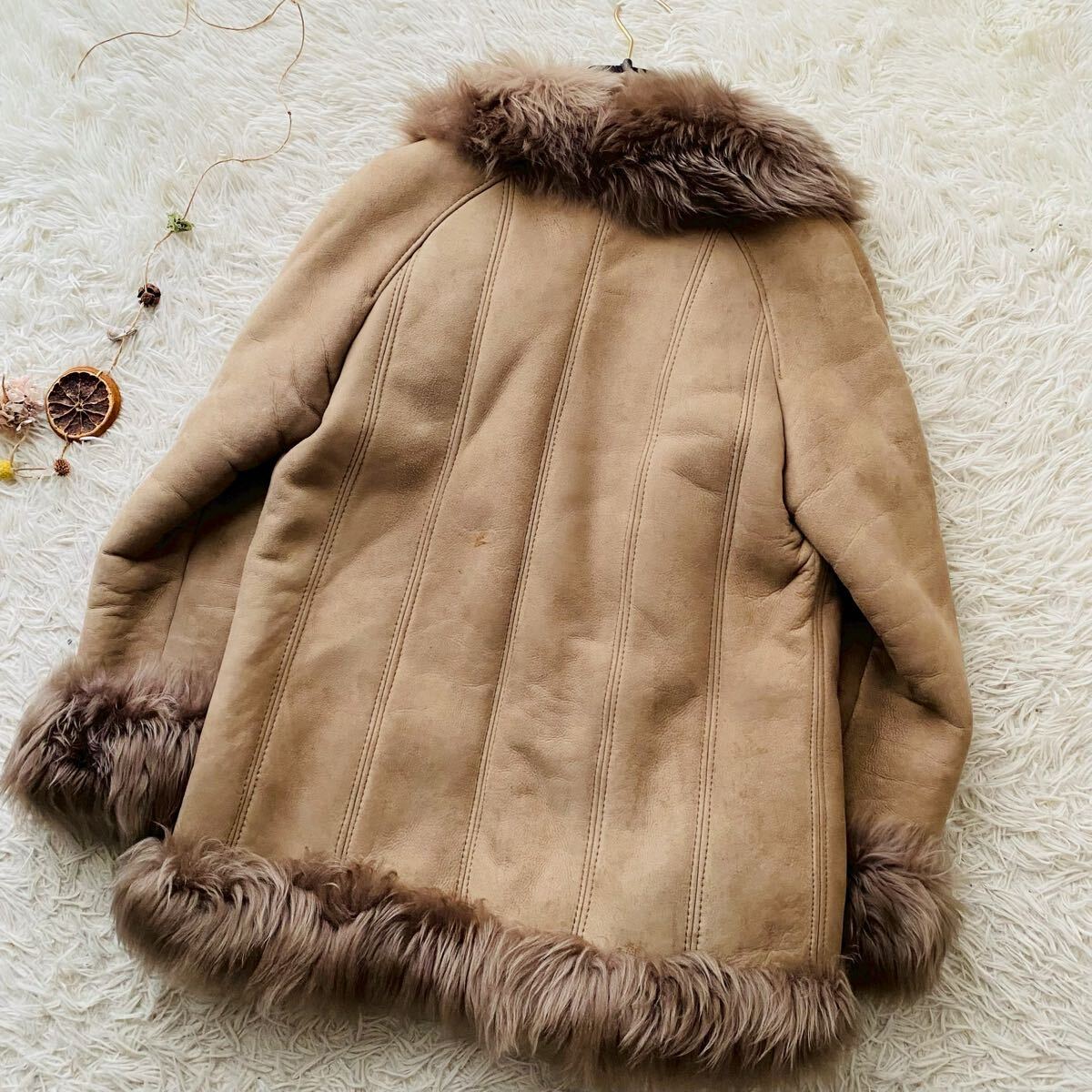*希少なスペイン製ベビーラムを使用したリアルムートンコート。生後一週間ほどの生まれて間もない仔羊の毛皮で作られたベビーラムは、きめが細かく柔らかいのが特徴。シェアリングされたスエードの表地からその柔らかさが伝わる高級ヴィンテージジャケットです。