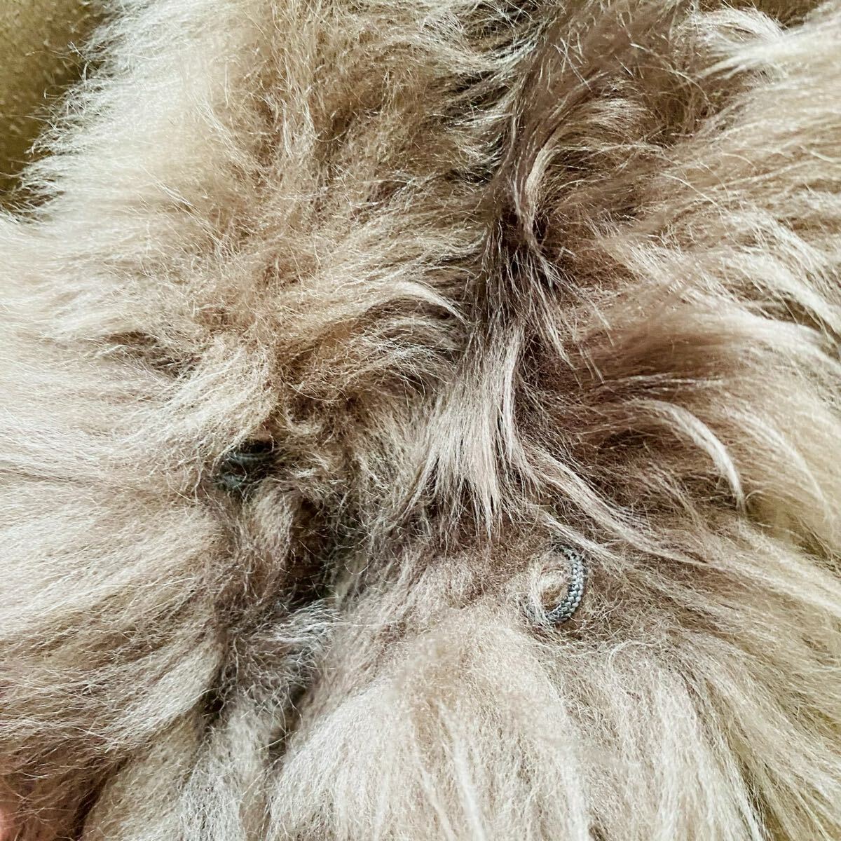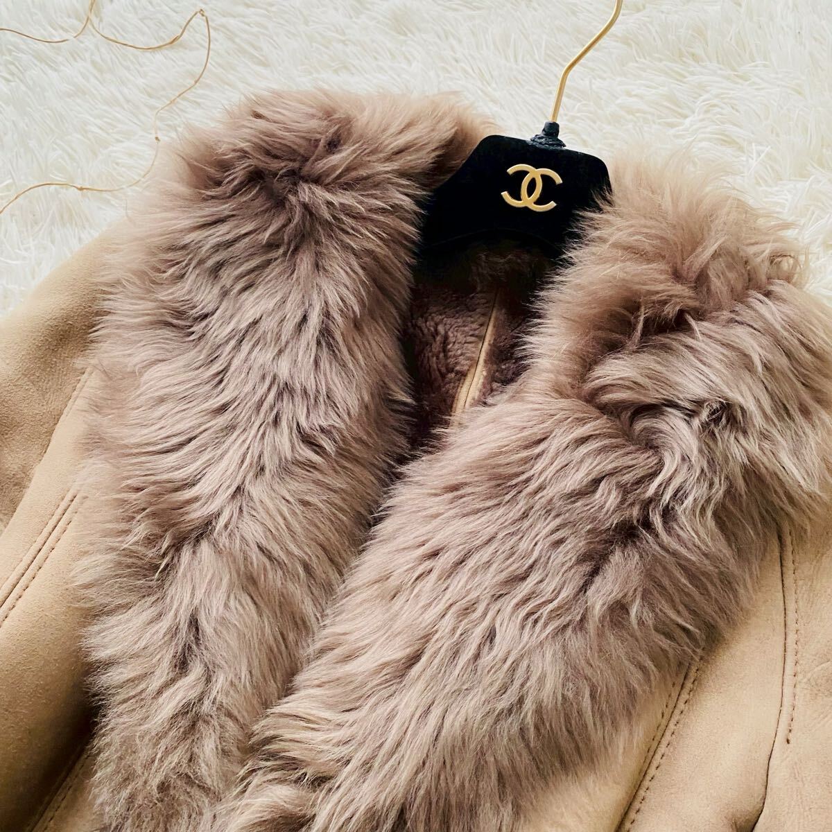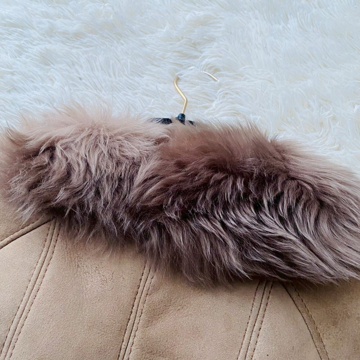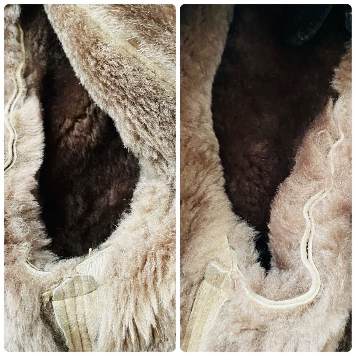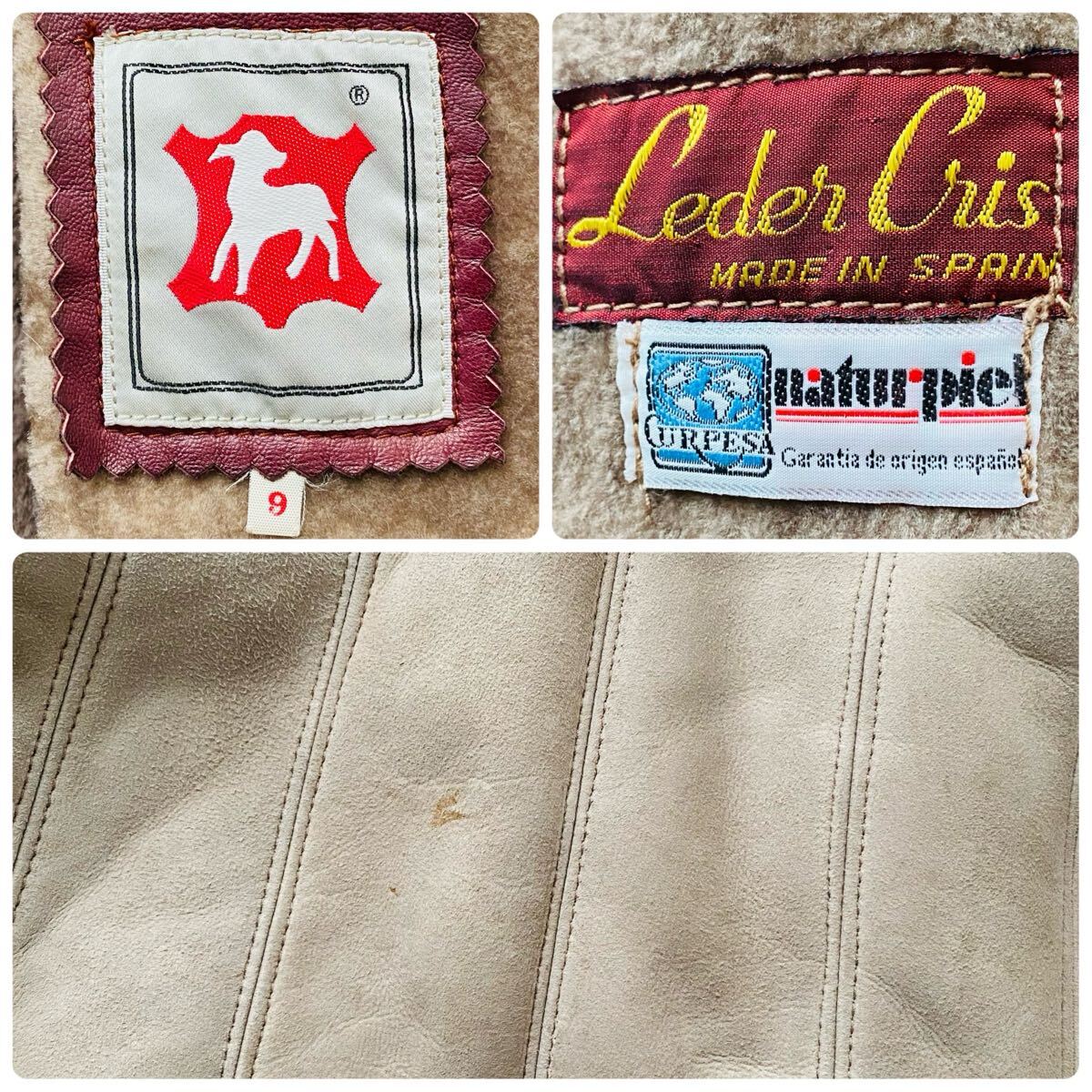 *希少なスペイン製ベビーラムを使用したリアルムートンコート。生後一週間ほどの生まれて間もない仔羊の毛皮で作られたベビーラムは、きめが細かく柔らかいのが特徴。シェアリングされたスエードの表地からその柔らかさが伝わる高級ヴィンテージジャケットです。