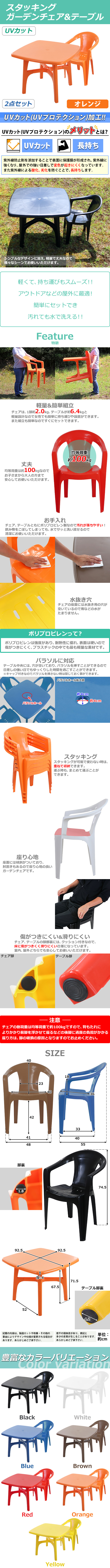 ●UVカット加工によって屋外での強い日差しで変色しにくくなっています。 ●紫外線による酸化、劣化を防ぐことにより、長持ちする作りになっています。 ●ガーデンチェアは、スタッキング構造なので重ねる事が可能なので、収納やまとめて運ぶ際にも大変便利です。 ●テーブル中央にパラソルなど、設置可能な穴があります。 ●テーブルは、簡単な組み立て式になります。チェアは、完成品です。 ●チェアは1脚約2kg、テーブルは約6.4kgと軽量なので、女性でも軽々持ち運べます。 ●材質は、軽量、安全、防水のポリプロピレン(PP)です。 注意! 背もたれによりかかり前脚を浮かせて座るなどの後脚に過度の負担がかかる座り方は脚の破損の原因となりますのでお止めください。 ■重量(チェア):約2kg(1脚あたり) ■耐荷重(チェア):約100kg(1脚あたり) ■重量(テーブル):約6.4kg ■耐荷重(テーブル):約100kg ■材質:PP[ポリプロピレン](チェア、テーブル)、ゴム(チェア脚裏)、PVC(テーブル脚裏) ●商品のカラーはオレンジとなります。 ●新品商品ではありますが、輸入商品の為、多少の擦り傷などがある場合がございますので、ご納得の上ご購入下さいませ。 ●ご購入後、お客様ご都合によるご返品、ご返金等は一切お受け致しておりません。 ●本商品を使用した際に発生したトラブル、事故につきまして、当社は一切の責任を負いません。ご使用に関しましては、全て自己責任にてお願い致します。 |