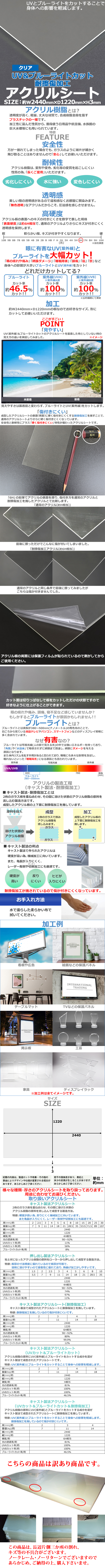 ※購入前のご注意 この商品は訳あり商品です。新品ではございますが、一か所約5cmのワレがある等の不具合がございます。ご了承頂いた方のみご購入ください。 ■テレビやPCなどに。 ■UV(紫外線)もシミ、シワ、たるみの原因となるUVA(紫外線A波)と日焼けの原因となるUVB(紫外線B波)をカット! ■さらに成型されたアクリルの表面(両面)に耐擦傷加工を施しています。 ■耐擦傷加工を施しているので通常のアクリルよりもさらに硬度が高く傷付きにくくなっています。 ■キャスト製法なので反りにくく機械加工に向いています。 ■亀裂が入りにくいのでレーザー彫刻や切削加工にも最適です。 ■無色透明なので圧迫感を感じさせません。 ■変形や変色、劣化などの変質を起こしにくい性質の為、長くご愛用いただけます。 ■サイズは約横2440mm×縦1220mmの板なので好きなように加工・カットができます。 ■お手入れ方法は水で濡らした柔らかい布で拭くだけ。 ■室内でご使用ください。屋外で使用されますと変色する可能性があります。 ■重量:約11.3kg ■カラー:クリア ■光の透過率:約81% ■表面硬度:約6H相当[自社検査] ■UVAカット率:約100% ■UVBカット率:約100% ■ブルーライトカット率:約46.5% ■材質:アクリル樹脂(PMMA)[キャスト製法・耐擦傷加工・UV(紫外線)/ブルーライトカット] ●大型の商品の為、 『西濃運輸の営業所留め』となります。 あらかじめご了承下さい。 ※最寄りの西濃運輸の営業所につきましては、ご注文確認後メールにてご連絡させて頂きます。 ●梱包サイズが大きい為、木枠もしくはパレットに固定しての輸送となります。荷受けには、フォークリフト等が必要になります。(お客様ご自身で、ご用意お願いします。) ●新品商品ではありますが、輸入商品の為、多少の擦り傷などがある場合がございますので、ご納得の上ご購入下さいませ。 ●ご購入後、お客様ご都合によるご返品、ご返金等は一切お受け致しておりません。 ●本商品を使用した際に発生したトラブル、事故につきまして、当社は一切の責任を負いません。 ご使用に関しましては、全て自己責任にてお願い致します。 |