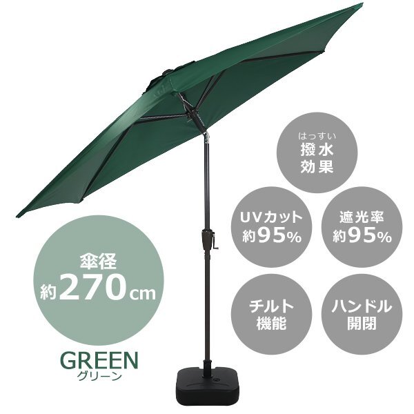 | 商品名 | 送料無料 ガーデンパラソル 直径約270cm ベースセット 撥水 UVカット 紫外線対策 日除け 日よけ 大型 チルト機能 角度調節 ハンドル開閉 紫外線対策 軽量 ベース付き 水 砂 ビーチパラソル パラソル スタンド BBQ アウトドア キャンプ 庭 カフェ parasolm706 |