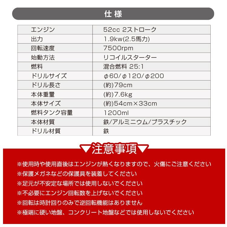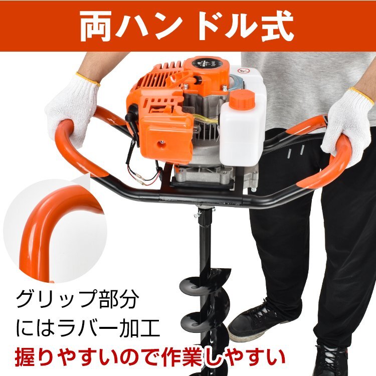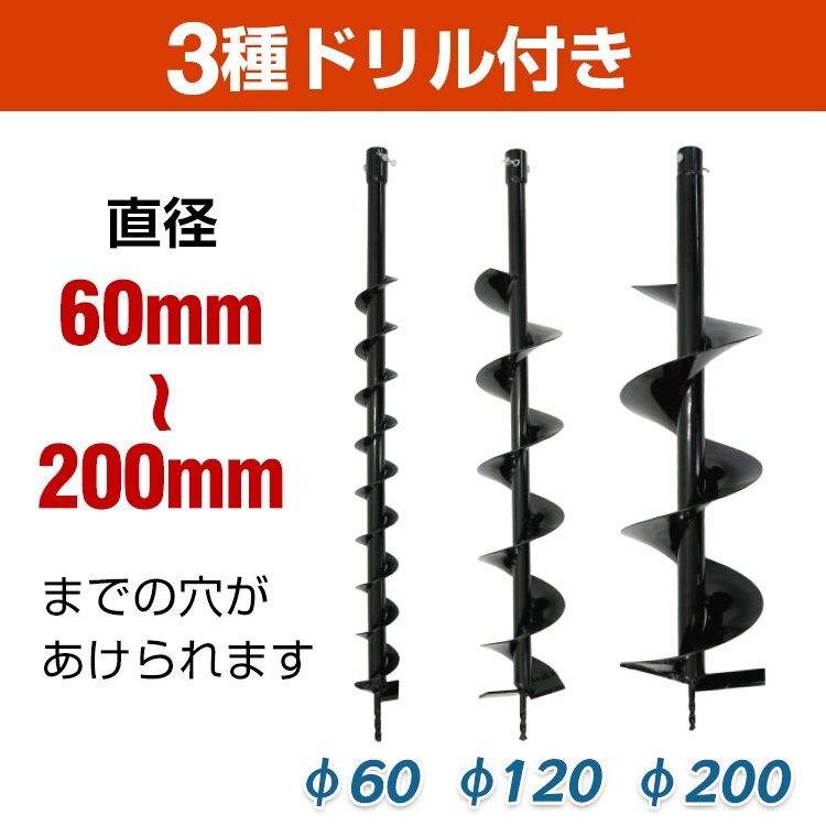 エンジン 穴掘り機 2サイクル 52cc 1.9kw アースオーガー 3種 ドリル付き φ60 φ120 φ200 杭打ち 植樹 穴開 種まき くい打ち 建設 sg048