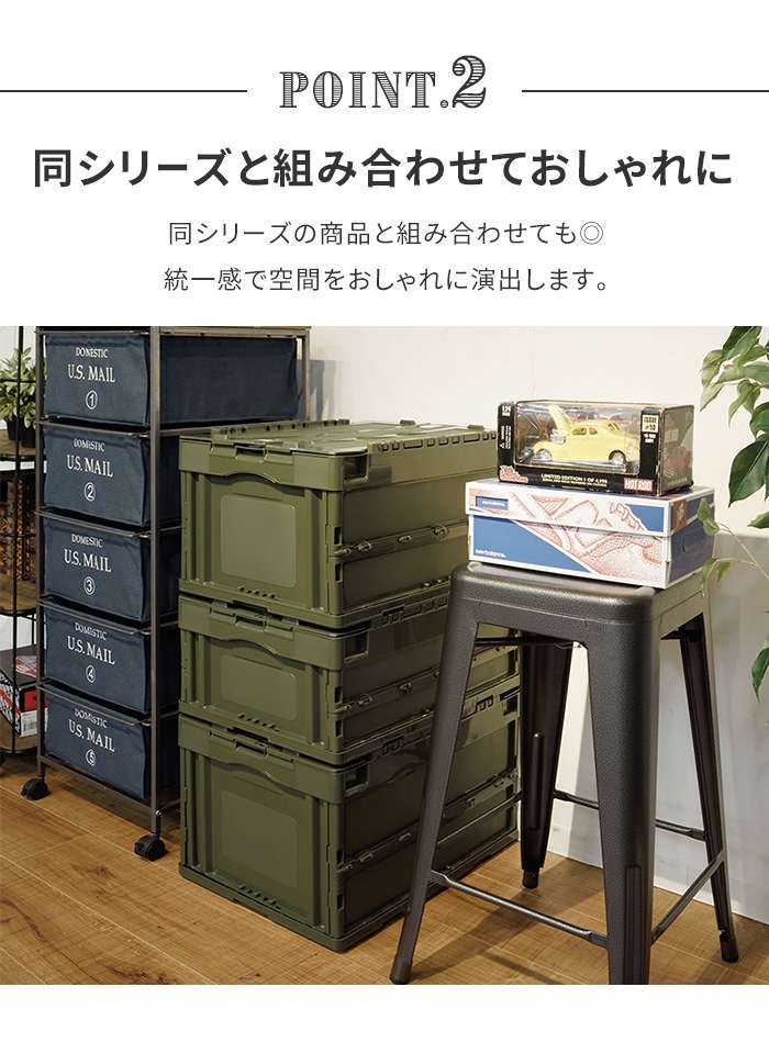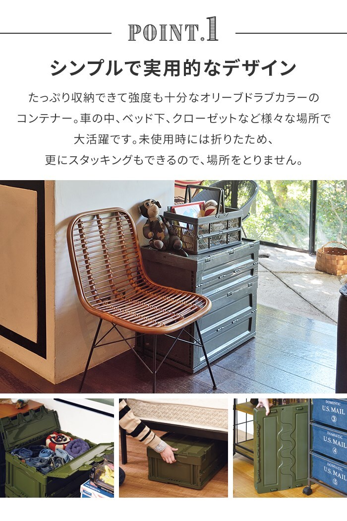 | たっぷり収納できて強度も十分なオリーブドラブカラーのコンテナー 車の中、ベッド下、クローゼットなど様々な場所で大活躍です。 未使用時には折りたため、更にスタッキングもできるので、場所をとりません。 |