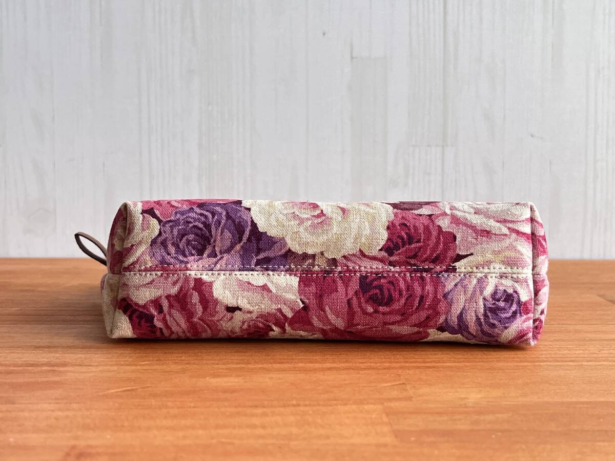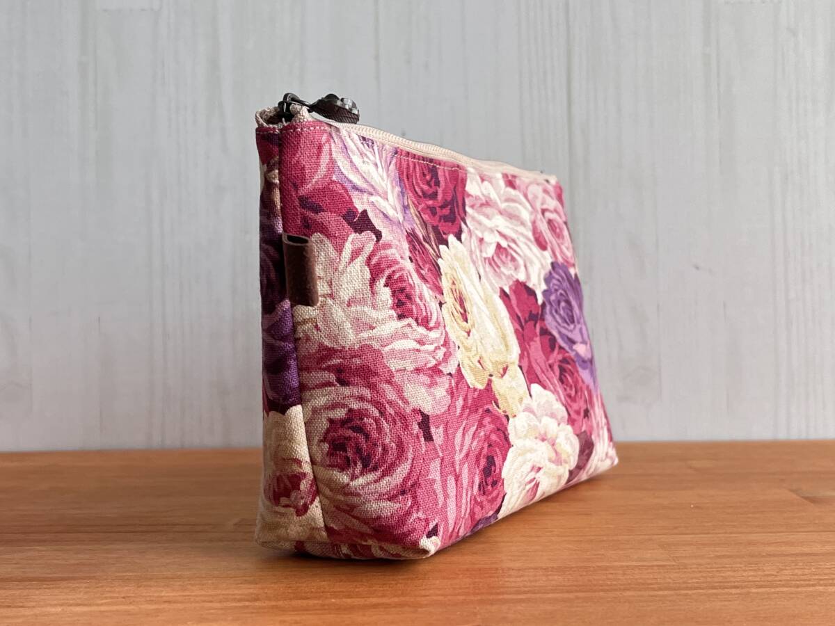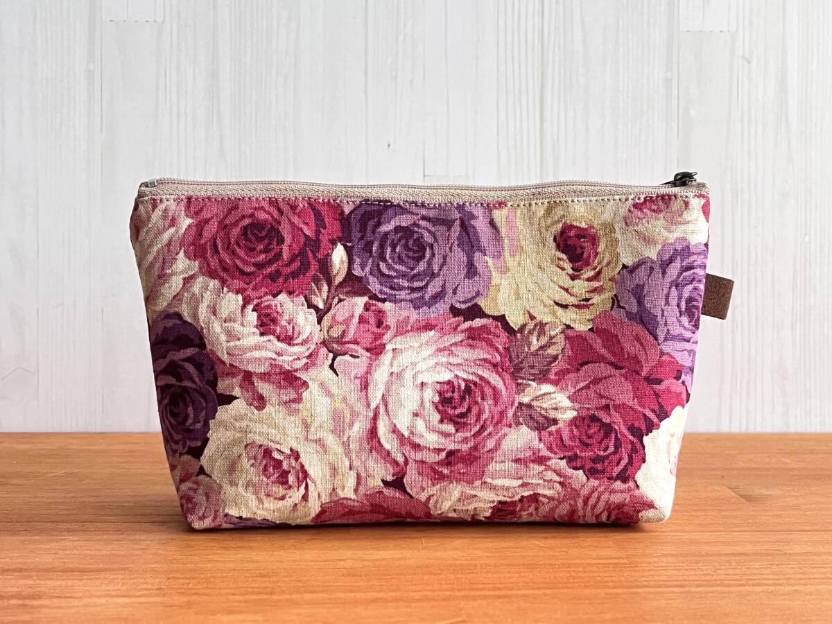 ハンドメイド+国産+コットンリネン+ローズ+バラ+ピンク系+花柄+ファスナーポーチ+コスメポーチ+c&s
