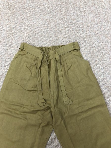 [パンツ] ダブルタック・ウエスト後ゴム入・ウエスト前紐調節・U型小銭入れ付ポケット左右各1・右後ボタン付ポケット・前ボタン、ファスナー付・裾紐調節