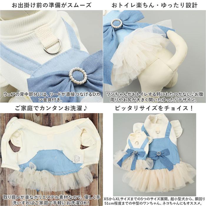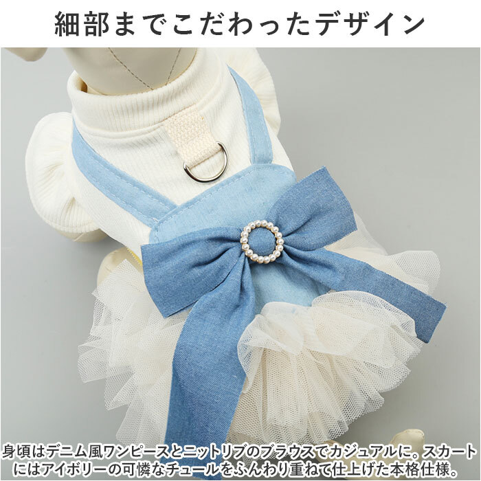 | 商品説明 | ・・大切なペットと一緒に、ハレの日をお祝いしたい♪そんな飼い主さんの願いを叶えた「ペット用カジュアルドレス(女の子用)」が新登場! ・【お祝いの席がパッと華やぐ】 ・ご友人の結婚パーティーやお子さまの誕生パーティなどの特別な日は、ワンちゃんもチュールがひらめくドレスで可愛くおめかし。お祝いの席に華やかさを添えるペット用ドレス。 ・【細部までこだわったデザイン】 ・身頃はデニム風ワンピースとニットリブのブラウスでカジュアルに。スカートにはアイボリーの可憐なチュールをふんわり重ねて仕上げた本格仕様で、キッズドレス顔負けのオシャレさ。 ・【スナップボタンで楽ちんお着替え】 ・広げたウェアをふわりと背中に被せ、両前足を優しく袖に通してから前合わせのスナップボタンを閉じるだけで着脱が簡単なデザイン。 ・【お出掛け前の準備がスムーズ】 ・ウェアの背中部分には、リードが直接つなげるDカン金具付き。首輪やハーネスを用意しなくても、ウェアを羽織ってリードを接続したらすぐにパーティにお出掛け♪ ・【おトイレ楽ちん・ゆったり設計】 ・ワンちゃんがおトイレする時にもたつかない♪お腹周りやお尻が大きく開いたゆったりデザイン。(※おトイレの時は、飼い主さんがスカートのチュールを束ねて、押さえてあげてください。) ・【ご家庭でカンタンお洗濯♪】 ・取り扱いが楽なポリエステル素材なので、優しく手洗いすればご家庭で手軽にお洗濯OK!こまめにお手入れして華やかな風合いをいつまでもキープ。(※アイロンがけ、タンブラー乾燥はご利用いただけません。) ・【ピッタリサイズをチョイス!】 ・XSサイズからXLサイズまでの5つのサイズから、ぴったりサイズがチョイス可能!超小型犬から、胴回り51cm程度までの中型のワンちゃんに最適なサイズ感。小さなサイズはネコちゃんにもオススメ。 ・【愛犬との記念撮影にも】 ・背中のデニム生地にふわりと結んだ大きなブルーのリボンと、フェイクパールのサークルブローチがアクセント。愛犬とご家族とのフォトジェニックな写真を撮りたいときに大活躍! |