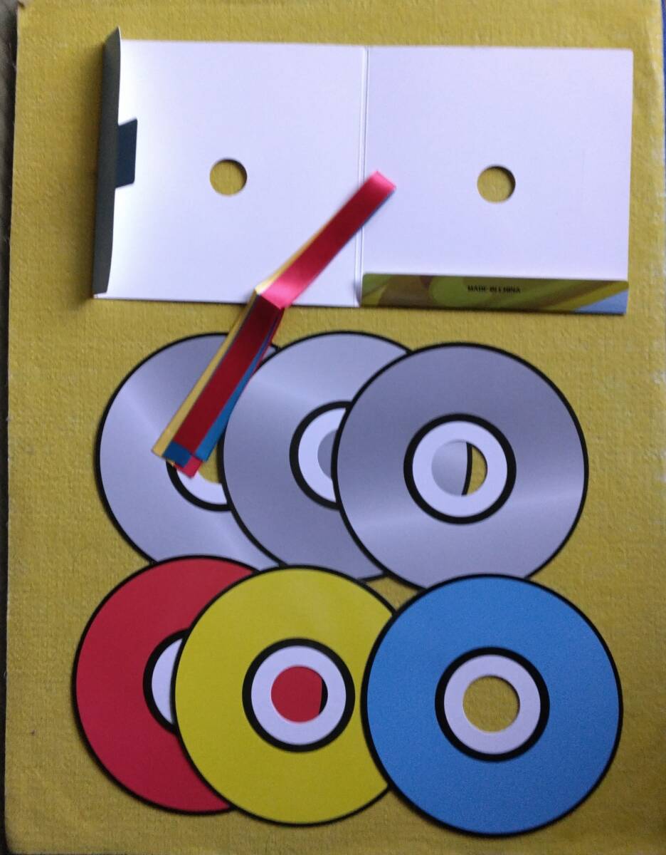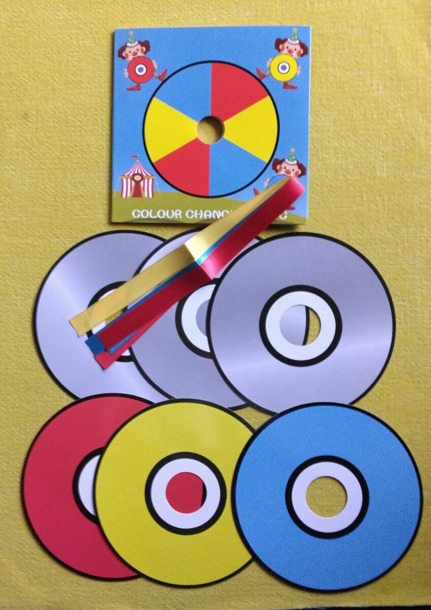 ★3枚の灰色ディスクが次々にリボンと同じ色に変化します、最後にはケースを広げて中が空である事をみせられます