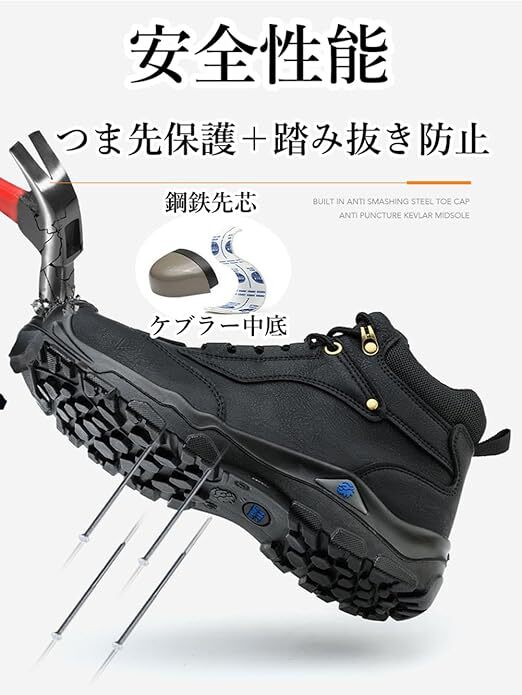 【つま先保護+踏み抜き防止】つま先部分には鋼先芯を入れた、刃物や重量物の衝撃から足を守ります。ケブラー中底を搭載して、釘から足をしっかり守ります。