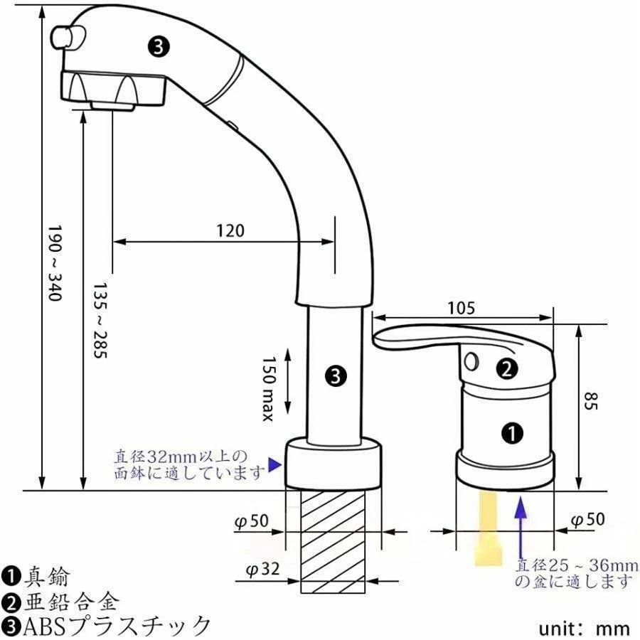 ■【2穴に取付可能】蛇口ノズルはφ32以上の面鉢に適用。コントロールレバーはφ25-25mmの取り付け穴に対応。取り付け芯ピッチ:100-105mm,取り付けホース付き:G1/2規格、2本(50cm),簡単に取り付け可能。
