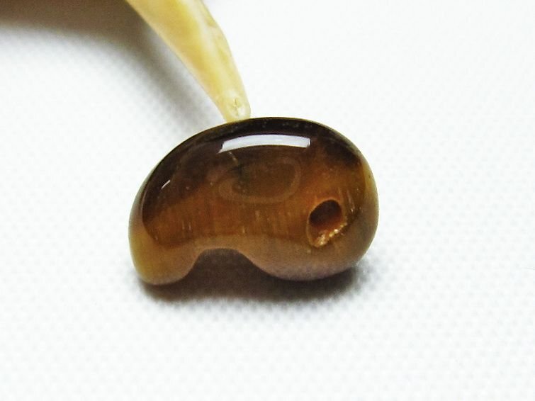 | ■商品名: タイガーアイ※黄虎目石勾玉 ■商品ID: T356-1364 ■商品重量:約 0.5g ■商品サイズ: 高約:11mm 横約:7mm 厚約:5mm 【タイガーアイ(虎目石)】 タイガーアイは角閃石の一種のクロシドライト(青石綿)に石英が染み込んで酸化し、茶色や黄金色になったものです。 研磨すると光の当たり具合によってキャッツアイ効果、またはシャトヤンシー効果と呼ばれる猫の目のような光の筋が見られ、その輝きと黄金色と褐色の縞模様が虎の眼に見えることからこの名前が付けられました。 ベーシックな金茶色の他にも様々な色合いがあり、温度が高い環境で生成されると深い赤みを帯びたレッドタイガーアイになります。 この他にクロシドライトが酸化せずに生成された灰色のグレータイガーアイは「ウルフズアイ(狼目石)」、濃青色をしたブルータイガーアイは「ホークアイ(鷹目石)」と呼ばれ、タイガーアイとは区別される場合があります。 タイガーアイは視野を広げ正しい判断力と行動力で成功へ導くとされ、ルチルクォーツに匹敵するほどの金運・仕事運アップストーンとして高い知名度と人気を誇っています。 また男性イメージの強い石ではありますが、強力な邪気払い・トラブル回避の効果も持ち合わせていますので女性にはストーカーやセクハラ対策のお守りとしても有用です。 ⇒ タイガーアイをもっと詳しく ◆ワンポイント情報 タイガーアイは塩分によって劣化しやすいので汗が付いた場合は柔らかい布で拭き取るようにし、塩を用いた浄化は行わないように注意しましょう。 |