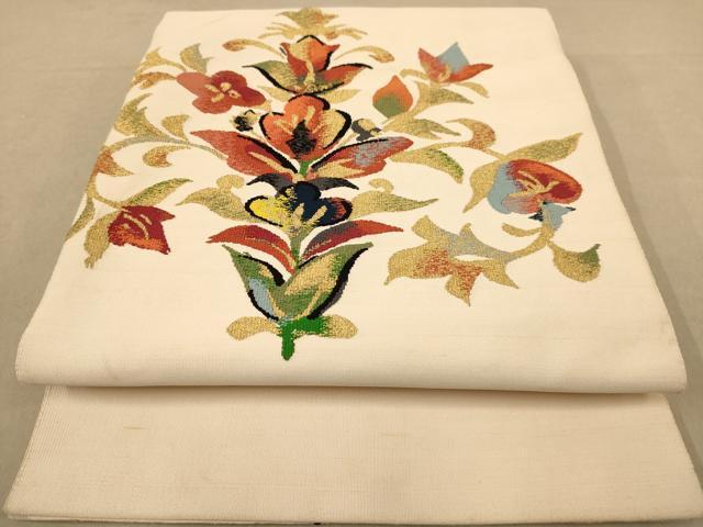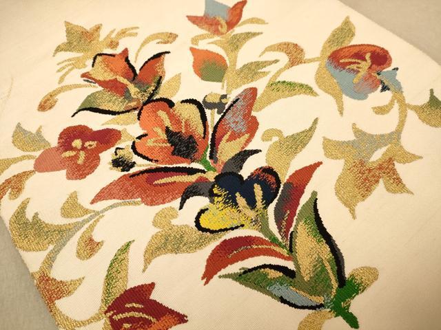 | 【正絹】 詳細に関しましては、画像をご確認ください。 爪で糸を1本1本掻きよせて織る爪つづれは 「日に寸、五日に寸、十日に寸」と伝えられるほどの 月日と高度な技術が必要であり複雑な文様になると 1日にわずか1cmしか織り進めないものもあります。 そのため極めて生産数も少なく希少価値の高い織物となっています。 元来生産数の少ないうえに職人さんの高齢化と後継者不足にともない 高度な技術をもった織師は年々減少している爪織本綴れ。 大変上質な逸品になります。 お安く出品致しますので、是非この機会にいかがでしょうか?