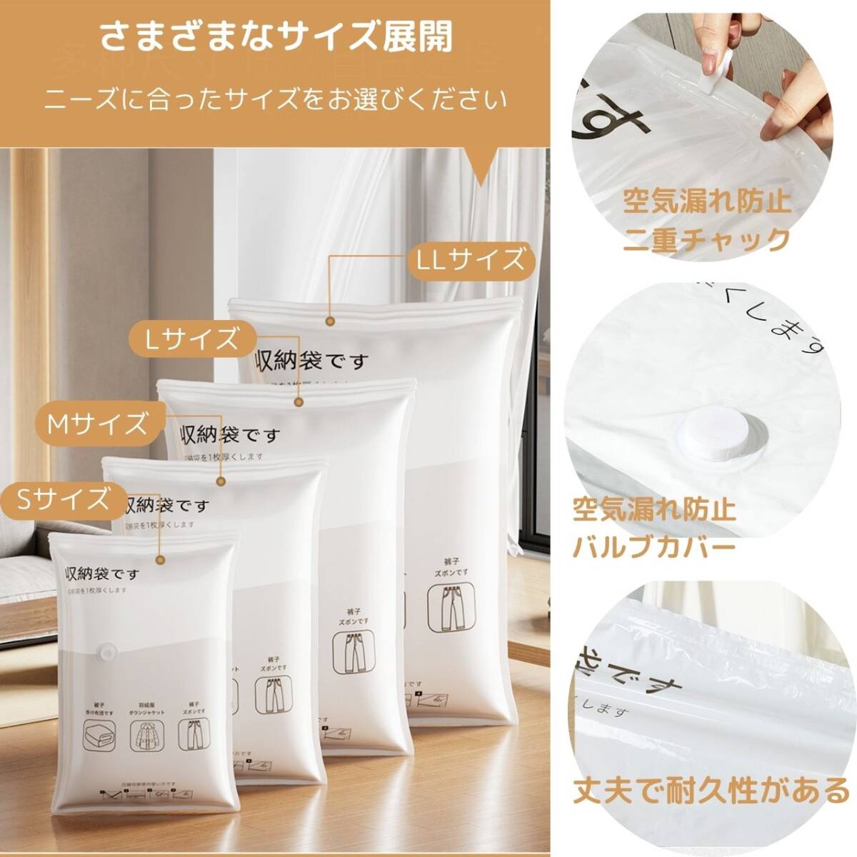 4サイズを2枚ずつご用意していますのでニーズに合った収納が可能です。布団や枕、毛布、ジャケットやブラウスなどの衣類など衣替えの際に大変便利です。旅行の際にも使えるSサイズも備え付けられています。