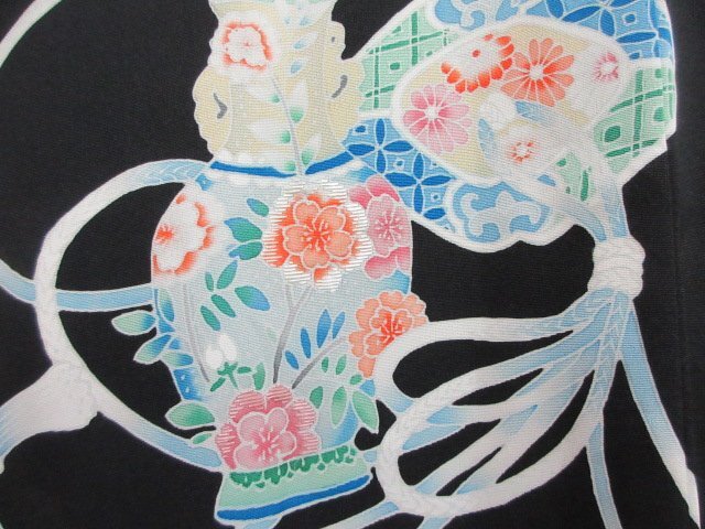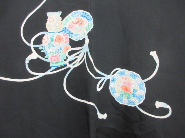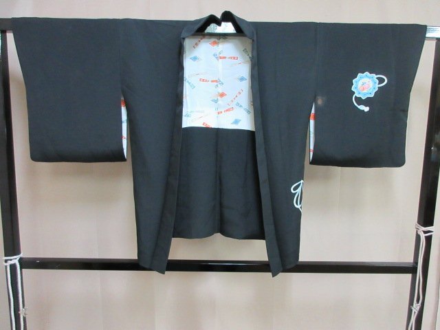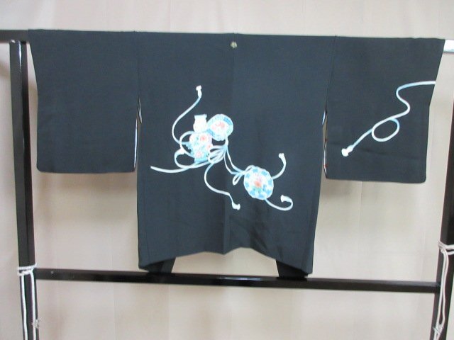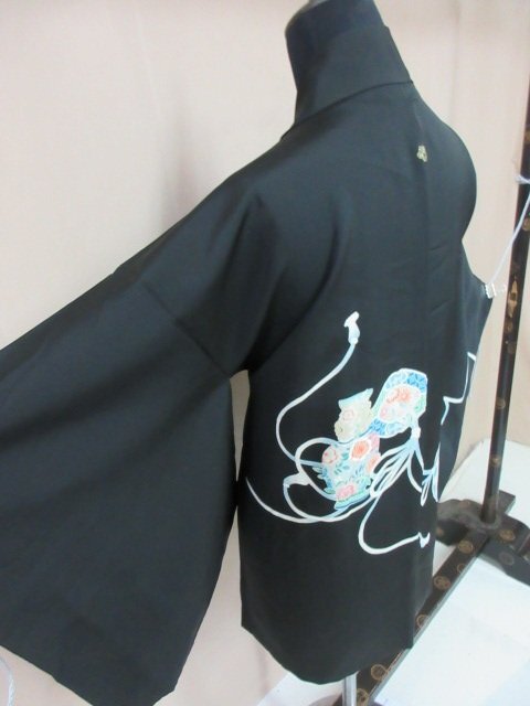| 商品名 | 1円 中古 羽織 正絹 和装コート 縮緬 黒 紋つき 陶器 鏡裏花文 草花 割付文様 袷 おしゃれ 身丈71cm 裄64cm【夢職】★ |