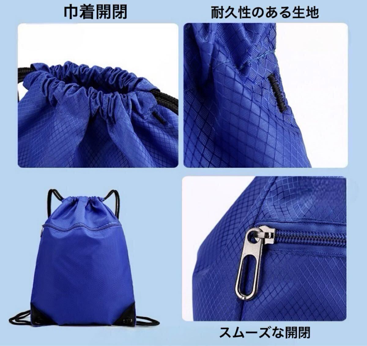 このナップサックは、さまざまなシーンで活躍する防水・撥水機能を持つ巾着バッグです。ジムやプール、旅行など多用途で使える大容量設計が特徴です。オックスフォード布を使用しており耐久性に優れ長期間使用することができます。特に撥水性があるため突然の雨や水しぶきから中身をしっかりと守ることができるのが嬉しいポイントです。