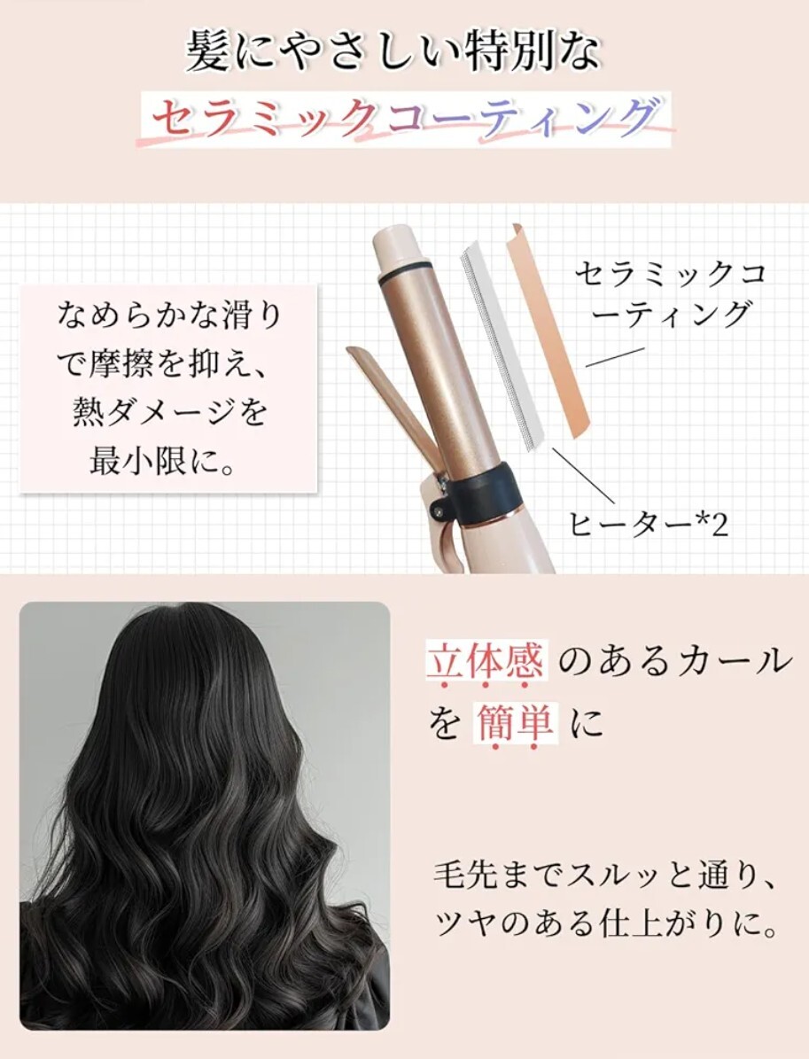 熱や摩擦で髪がパサつく──そんな不安に寄り添うトルマリンコーティングプレート。摩擦を抑えながらキューティクルを守り、静電気を防止。引っかかりのないスルッとした滑り心地で、スタイリング剤なしでもぷるんとツヤのある立体カールを実現。使うたび、髪にうるおいと自信を感じる仕上がりに導く。