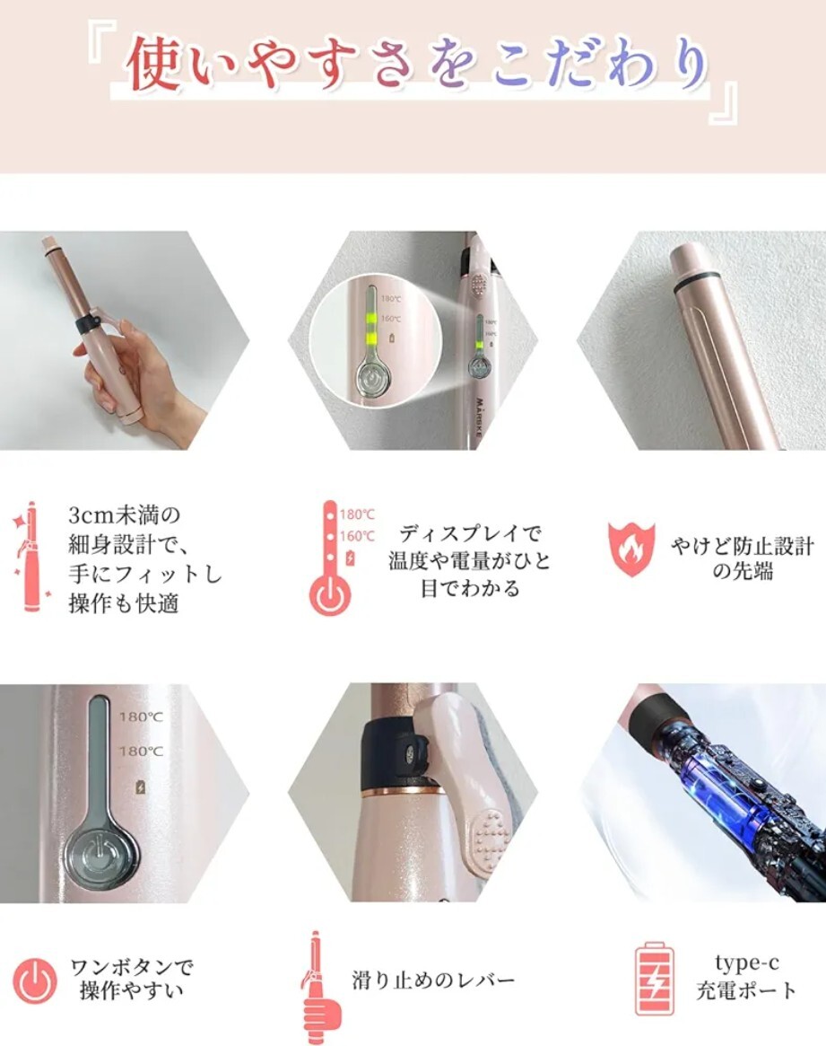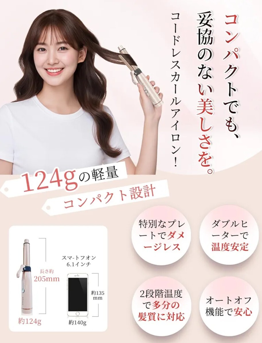 ●このコードレスカールアイロンは、わずか124gの軽量設計で持ち運びに便利なコンパクトサイズ。19mmのバレルで、自然な立体感のあるカールを簡単に作れます。160℃~180℃の2段階温度調整機能を搭載し、様々な髪質に対応。特殊なセラミックコーティングで髪へのダメージを抑えながら、美しいツヤのある仕上がりを実現します。30秒の急速立ち上がりで、忙しい朝のスタイリングにも最適。15分後の自動電源オフ機能で安心・安全な使用が可能です。前髪、ボブ、ロングヘアまで、細かい部分のスタイリングも自由自在。男女問わず使える万能アイテムで、サロン帰りのような美しい髪型を手軽に作れます。205mmのコンパクトなサイズながら、プロ仕様の実力を備えた使いやすいヘアアイロンです。