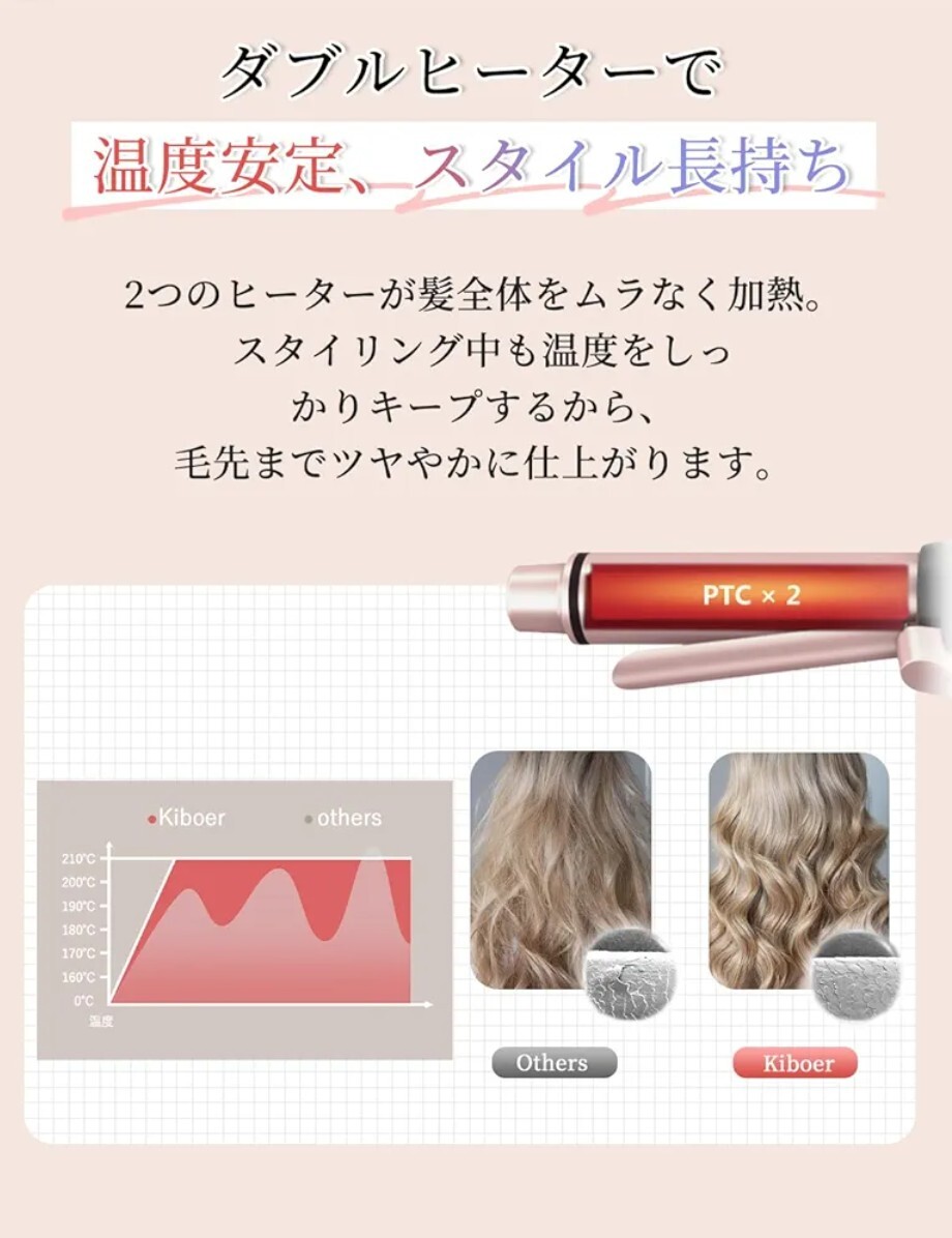 「重くてかさばる」「コンセントがない場所で使えない」──そんなお悩みに着目。Kiboerミニカールアイロンはわずか約124gの超軽量で、コードに縛られないコードレス設計!直感的に使いやすく、髪全体を巻いても腕が疲れにくい。ポーチにもすっきり入るサイズ感で、外出先・車内・旅行中でも今すぐ整えたいその瞬間にサッと使える。気になる前髪やハネも、すぐ整えられる。