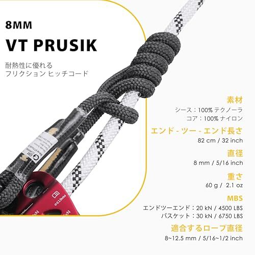 ダブルブレード構造◆◆耐摩耗性のナイロン繊維製のコア(内芯)は内側からプルージックコードを保護します。ブラックケブラーやイエローケブラー繊維で縫製されるステッチ部分に熱収縮スリーブに保護され、二重編み構造と組み合わせ、最も優れる耐摩耗性と高強度を持つプルージックコードは、より長く使用でき、各方面に使用できます。