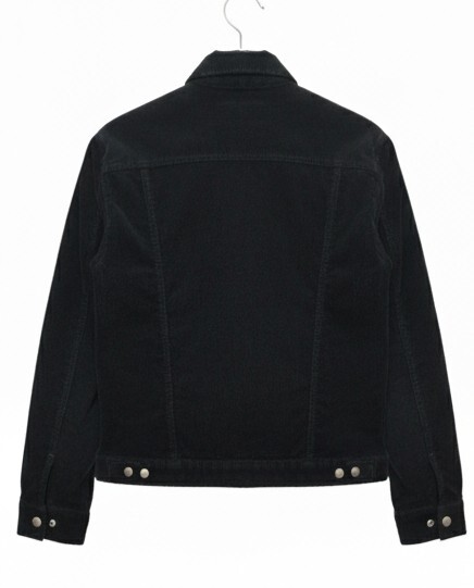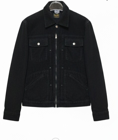 デザインはGジャン(トラッカージャケット)タイプを踏襲しつつ、フロントがジップアップ仕様になっており、着脱しやすくモダンな印象です。シックな**ブラック(黒)**のコーデュロイ素材で、カジュアルながらも上品に着こなせます。