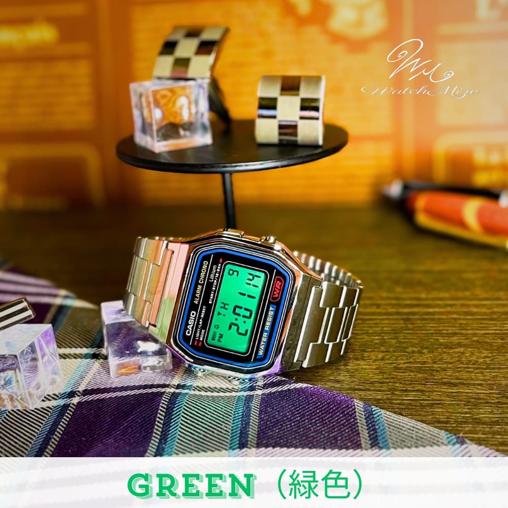 ご覧いただきありがとうございます! CASIO Collection A158WA-1JH 『グリーン液晶』カスタム 【カラーバリエーション】 ①ブルー ②グリーン ③ピンク ④ライム ⑤パープル ⑥レッド ⑦イエロー ⑧グレー ※こちらのページは、『グリーン液晶』の販売ページとなります。 その他の色はマイページよりご購入頂けます。 ・「周りと違った腕時計を身に付けたい方」 ・「推しのカラーの腕時計を身に付けたい方」 ・「好きな色の腕時計をお探しの方」 ・「日頃のコーディネートに合わせた腕時計をお探しの方」 ・「自分だけのオリジナル腕時計をお探しの方」 ・「カップルや友達同士で色違いやお揃いの腕時計を身に付けたい方」等 お好みのカラーの液晶で腕時計ライフをより充実させてみませんか? こちらで取り扱っている腕時計は、全てカシオ正規品であり、液晶部分以外は何も触っておりませんので、国産時計の高品質な腕時計をお楽しみ頂けます! |