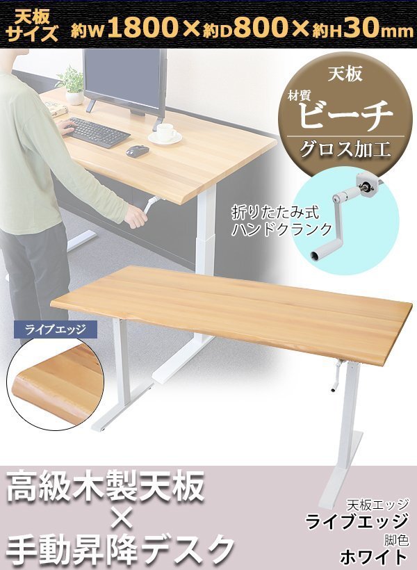 | 商品名 | 送料無料 昇降デスク 手動 W1800×D800×H735~1185mm ビーチ材 高級 木製 天板 グロス加工 耐荷重約70kg(脚部) スタンディングデスク 上下昇降 デスク 手動昇降 上下昇降 昇降デスク 高さ 調整 オフィスデスク 昇降式デスク 昇降テーブル 昇降式テーブル ライブエッジ 脚色 ホワイト hk01180beechg |
