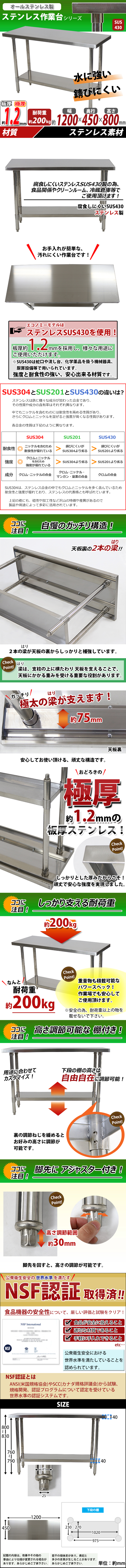 | 商品紹介 | ●水に強く錆びにくい、ステンレス製の作業台です。 ●腐食しにくいステンレスSUS430製です。 ●厨房やクリーンルーム等でご使用頂けます。 ●お手入れが簡単な、汚れにくい作業台です。 ●安心してお使い頂ける、頑丈な構造です。 ●高さ調節が可能な棚付き。 ●脚先にはアジャスター付き。 ●シリーズでサイズを豊富にご用意しております。 ※こちらの商品は、組立て式です。 ●新品商品ではありますが、輸入商品の為、多少の擦り傷などがある場合がございますので、ご納得の上ご購入下さいませ。 ●ご購入後、お客様ご都合によるご返品、ご返金等は一切お受け致しておりません。 ●本商品を使用した際に発生したトラブル、事故につきまして、当社は一切の責任を負いません。ご使用に関しましては、全て自己責任にてお願い致します。 |