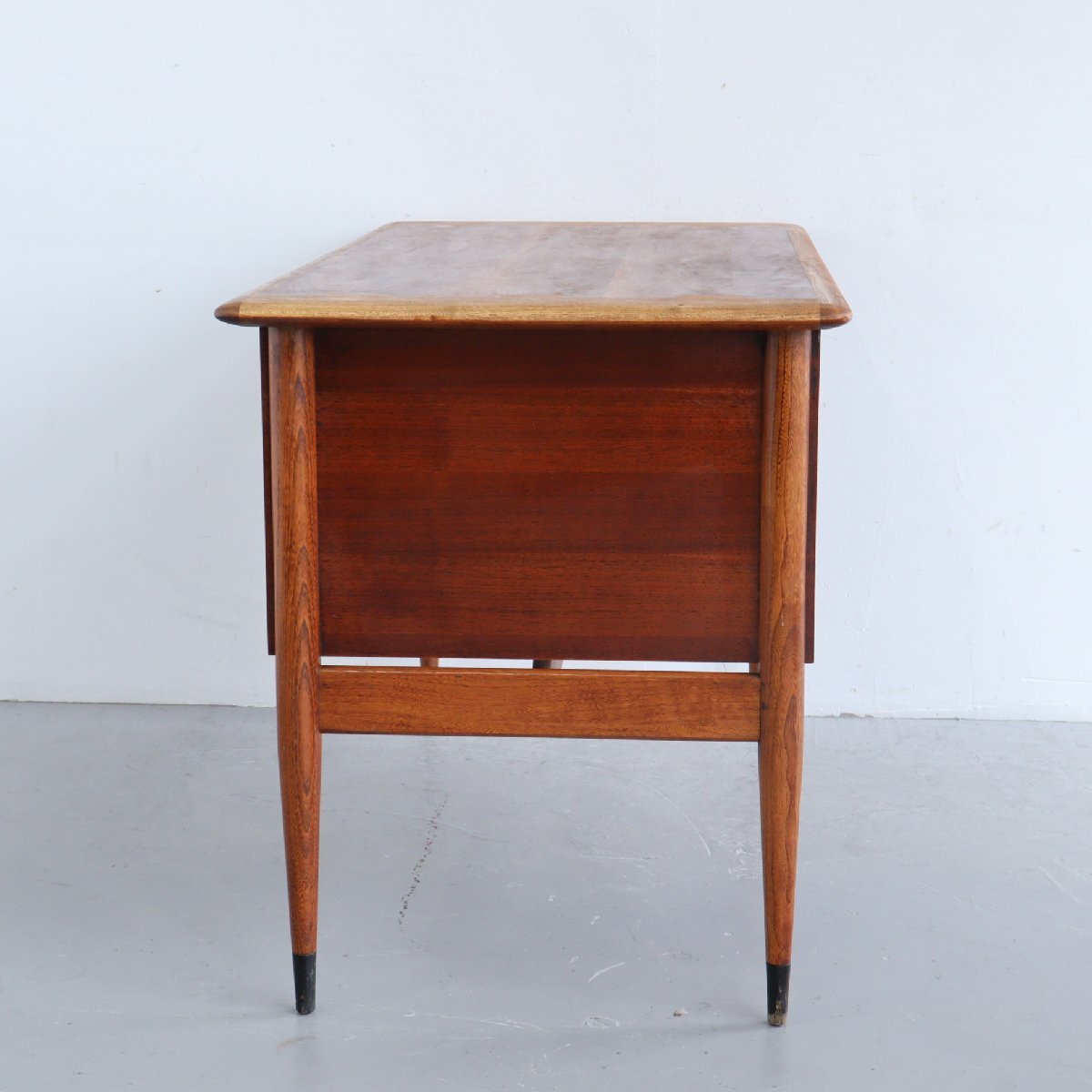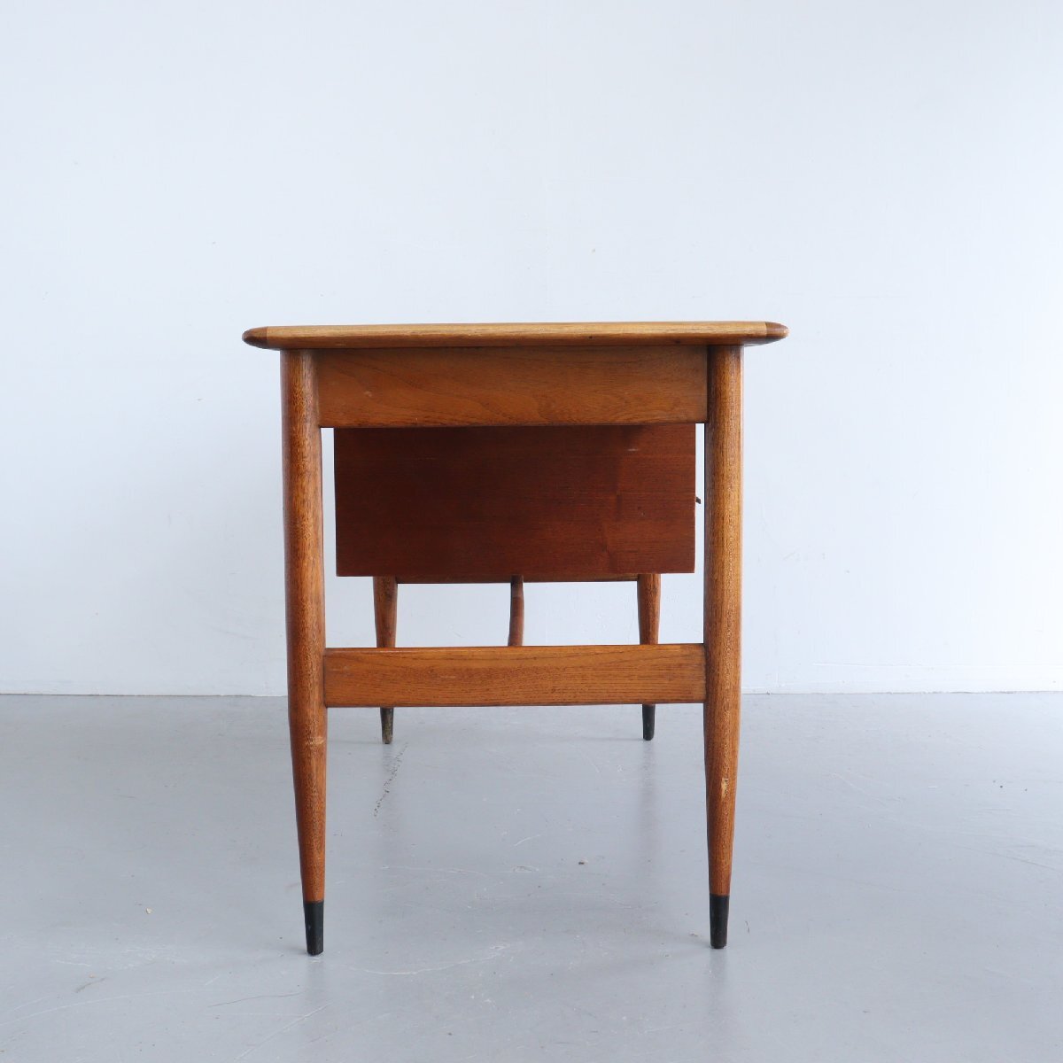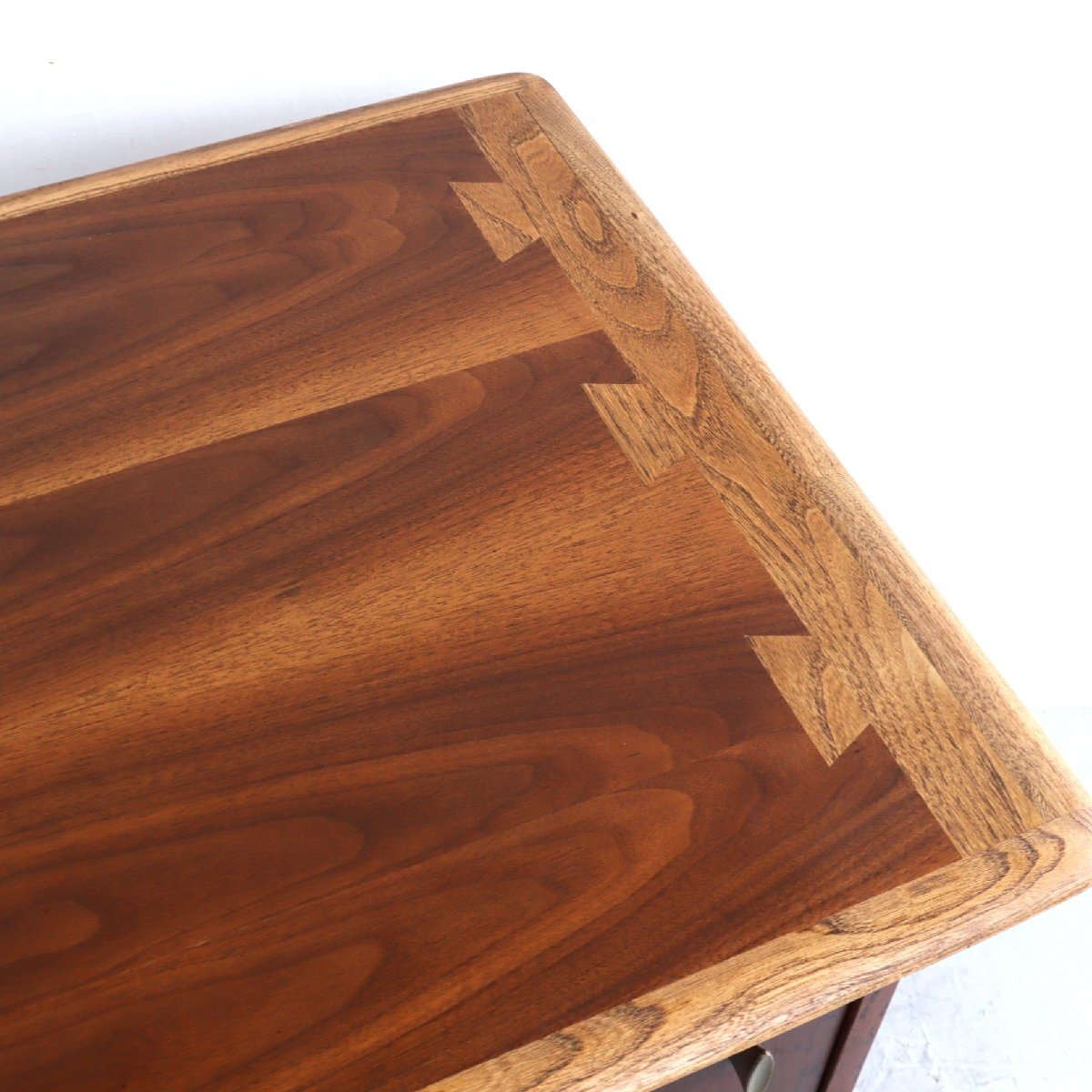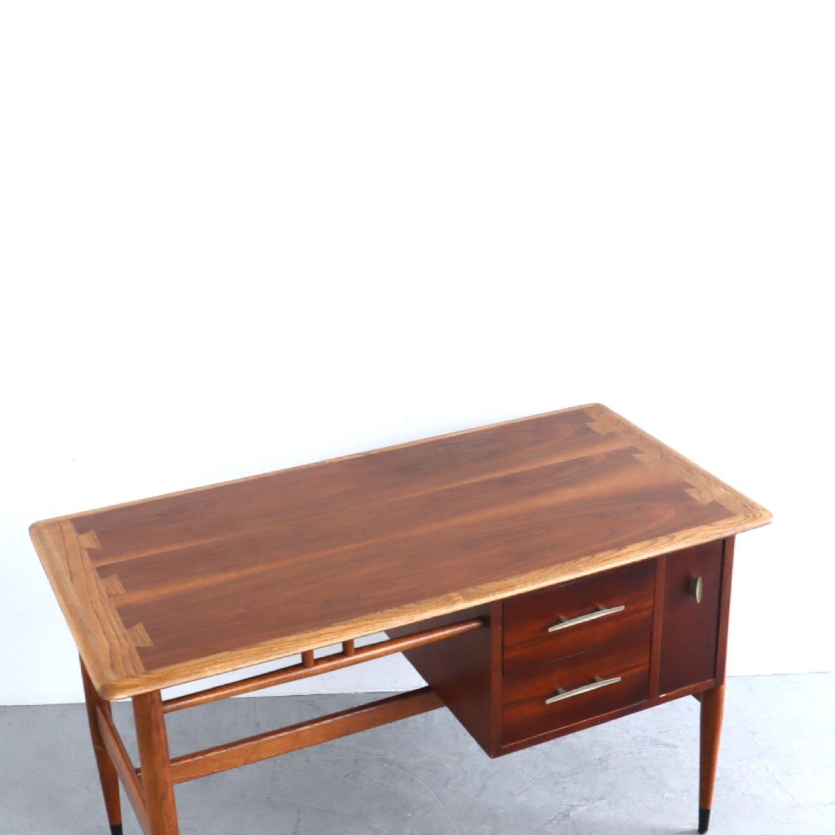 | 商品説明 explanation | ミッドセンチュリーを代表する、アメリカの家具メーカー 「LANE」社のサイドテーブルです。 ACCLAIMシリーズのもので、ダブテイルという天板の端に鳩の尾のような組木模様がデザインされています。天板はウォルナット×オーク材で綺麗な木目です。 サイドテーブルはよく見かけますが、デスクはかなり希少です。現行品でも雰囲気の良い木製のデスクは中々見つからないかと思います。 作業や読書などをしてもゆとりのあるサイズで、引き出しもある為、使い勝手も良いです。 どこか見てみ綺麗なシルエットでディスプレイするだけで雰囲気がでます。 店舗やご自宅にいかがでしょうか。 |