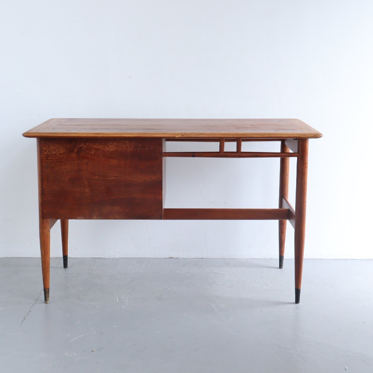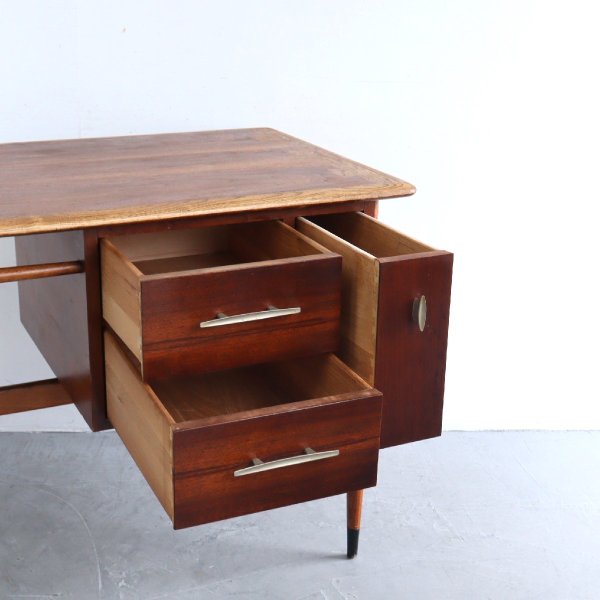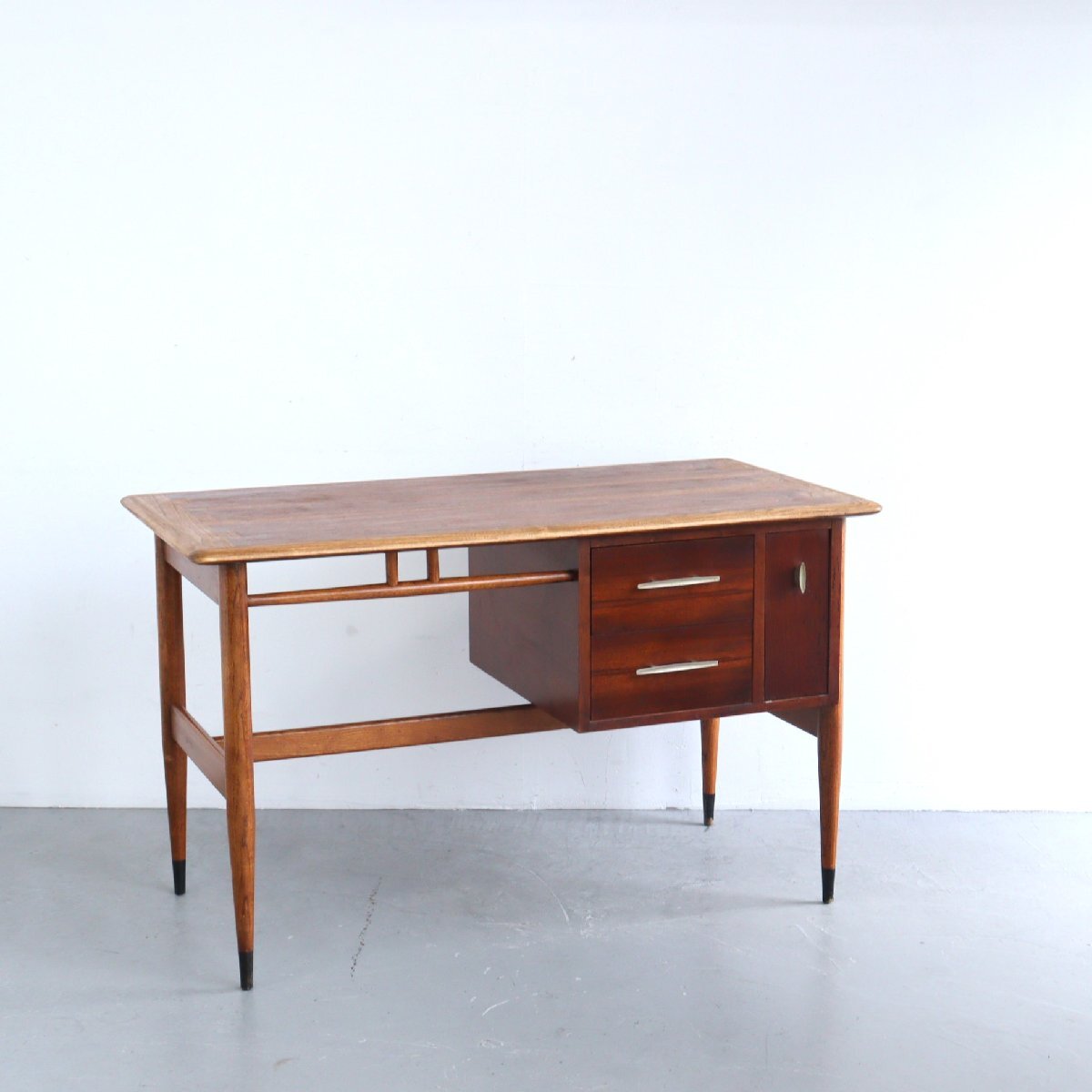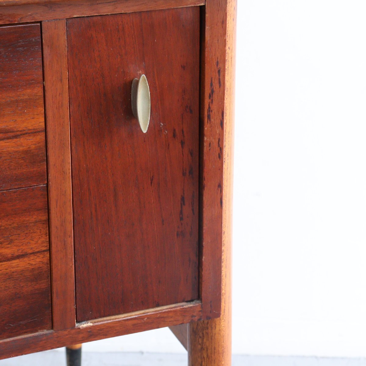| 商品説明 explanation | ミッドセンチュリーを代表する、アメリカの家具メーカー 「LANE」社のサイドテーブルです。 ACCLAIMシリーズのもので、ダブテイルという天板の端に鳩の尾のような組木模様がデザインされています。天板はウォルナット×オーク材で綺麗な木目です。 サイドテーブルはよく見かけますが、デスクはかなり希少です。現行品でも雰囲気の良い木製のデスクは中々見つからないかと思います。 作業や読書などをしてもゆとりのあるサイズで、引き出しもある為、使い勝手も良いです。 どこか見てみ綺麗なシルエットでディスプレイするだけで雰囲気がでます。 店舗やご自宅にいかがでしょうか。 |