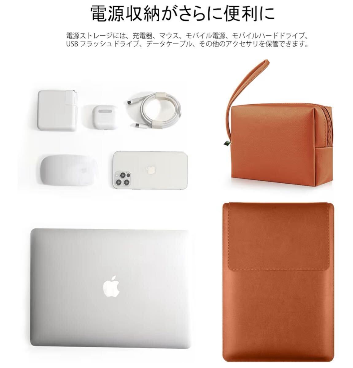 アダプター、充電器、マウス、イヤホンなどの小物を収納できる収納ポーチ付き。外出時に便利です。