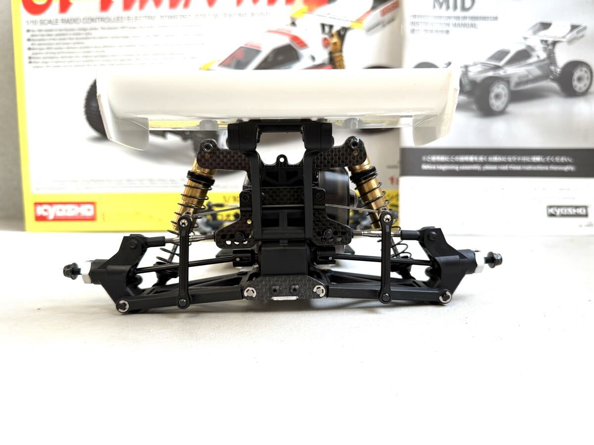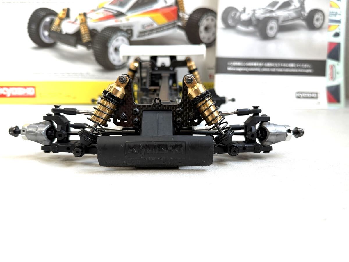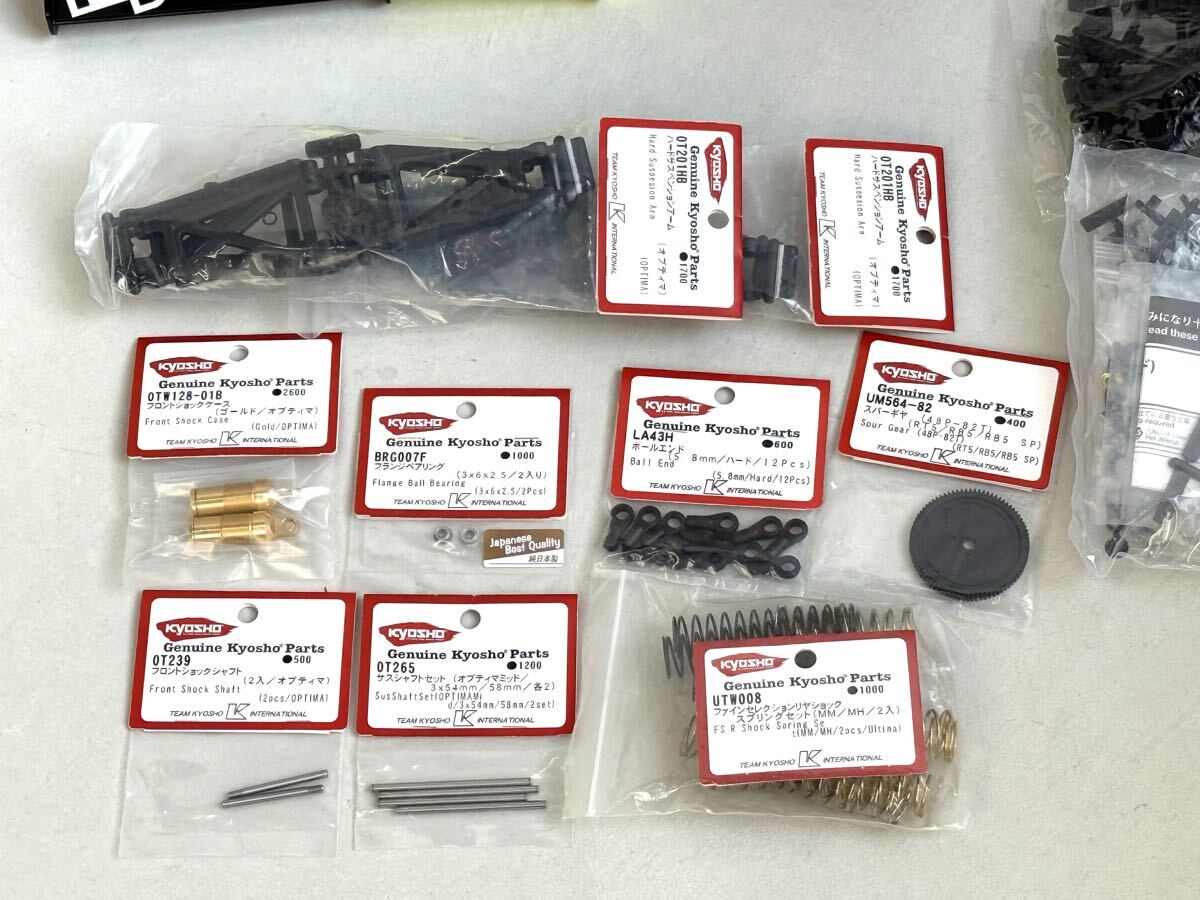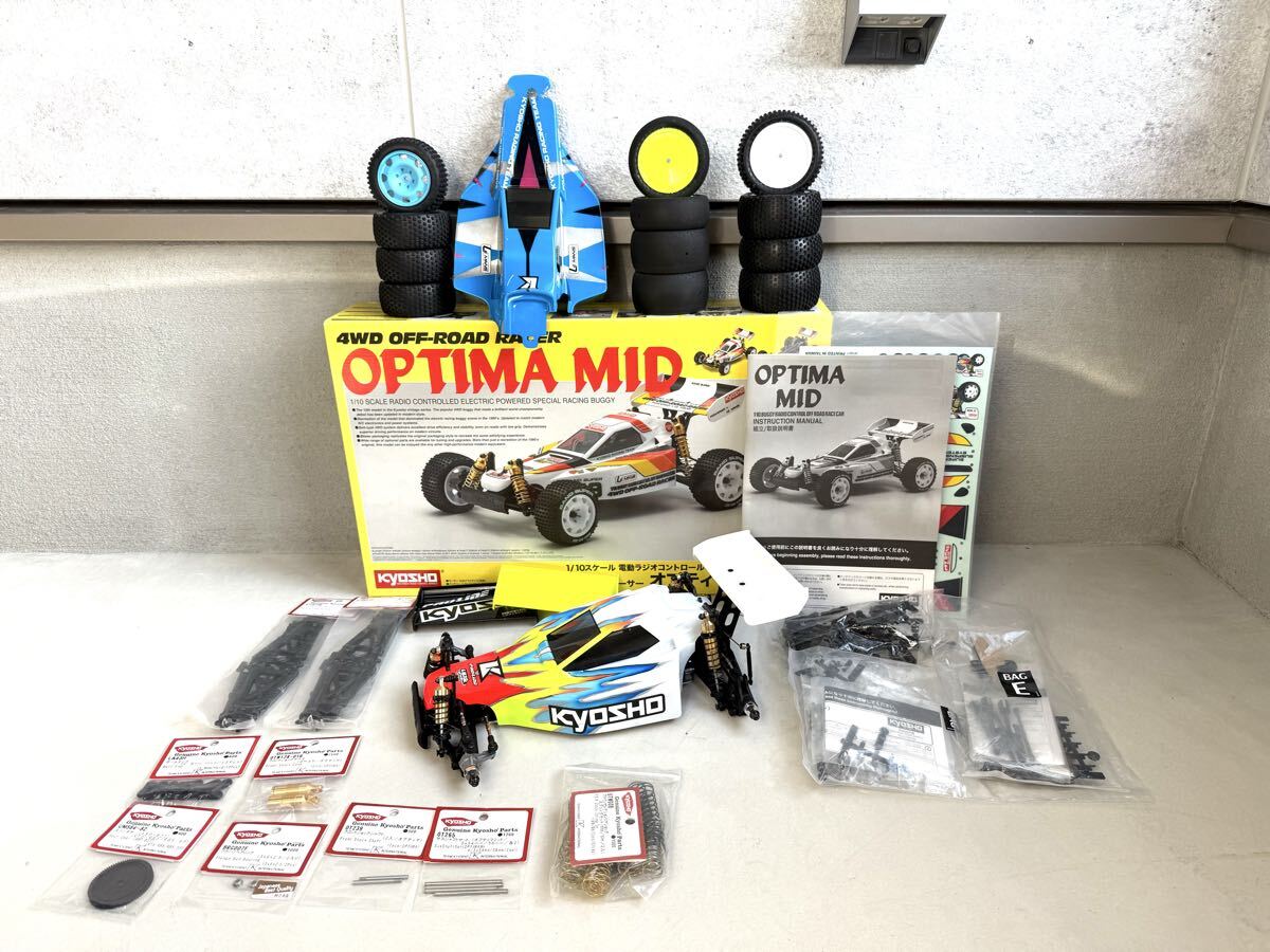 京商1/10EP4wdビンテージバギーオプティマミッドオプション多数装備の中古です。メインシャーシ以外はオプションのカーボンに変更済み、HDギヤ、CNCモータープレート、チタンターンバックル、ユニバーサルシャフト、前後スタビライザー等です。また、オフロードでの走行はしていません。新品パーツのフロントダンパーケース、スパーギア、ロアーアーム、ロッドエンド、ダンパーシャフト、サスピン、ベアリングなど、ファインセレクションスプリングがあります。ノーマルタイヤは未接着、2.2ダートホグタイヤはスリックとピン有りです。キット付属品は全て揃ってます。4WD レーシングバギー オプティマミッド 30622